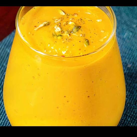 Mango lassi is a creamy drink made with mango, yogurt, and milk.