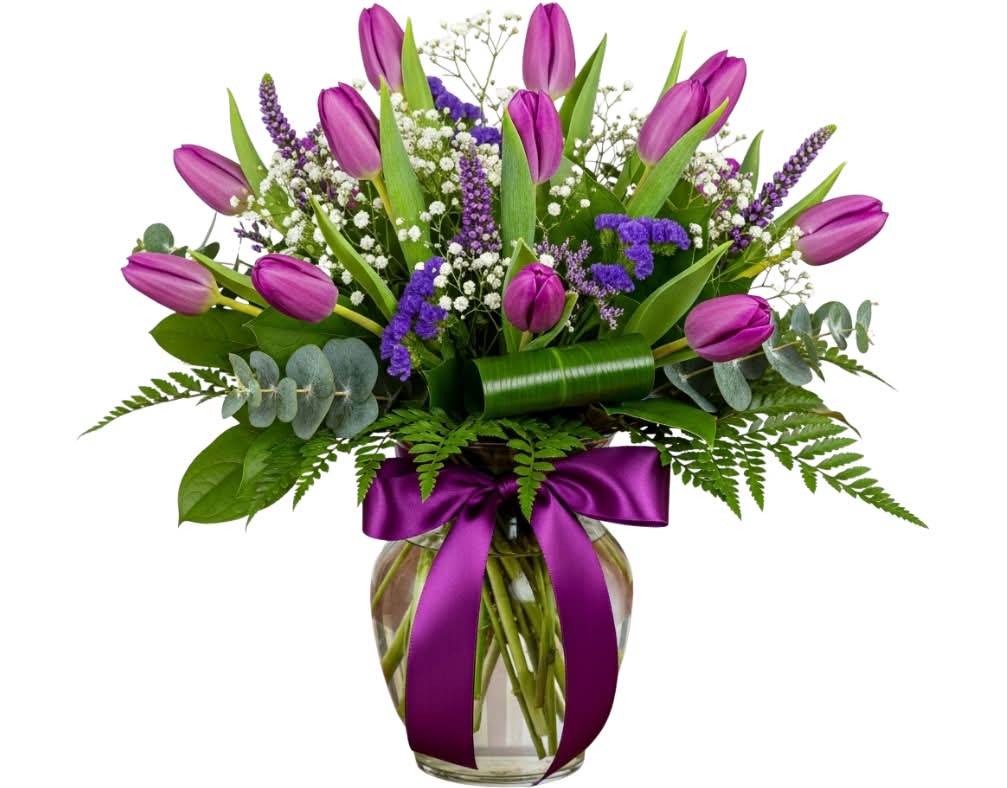 A graceful arrangement of elegant purple tulips beautifully displayed in a clear glass vase. Accented with delicate filler blooms and lush greenery, this design radiates sophistication and charm. Perfect for brightening up living spaces, gifting on special occasions, or simply adding a touch of natureís elegance to any room. A timeless choice for tulip lovers.