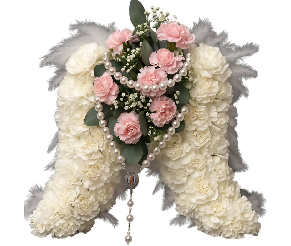 Express your deepest condolences and honor a cherished memory with our Baby Wings arrangement. This heartfelt tribute features a pair of elegant wings crafted from serene white carnations, symbolizing peace and a gentle journey. Accented with delicate pink flowers and soft baby's breath, it's a beautiful way to offer comfort and remembrance.