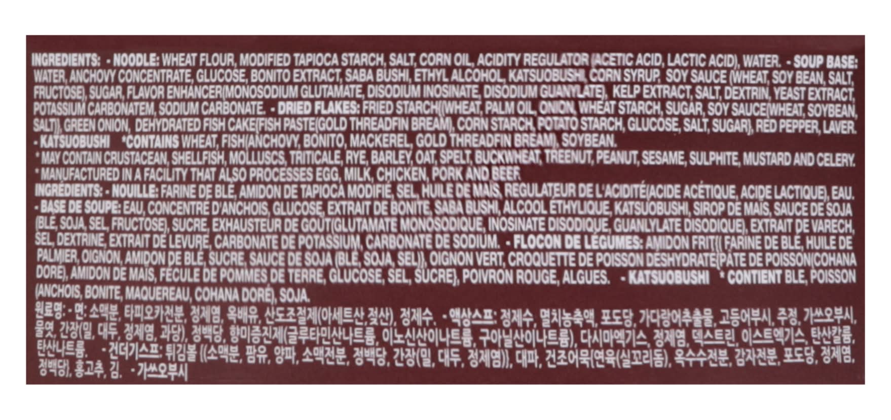 Ingredients: Noodle: Wheat Flour, Modified Tapioca Starch, Salt, Corn Oil, Acidity Regulator (Acetic Acid, Lactic Acid), Water, Soup Base: Water, Anchovy Concentrate Glucose, Bonito Extract, Saba Bushi, Ethyl Alcohol, Katsuobushi, Corn Syrup, Soy Sauce (Wheat, Soy Bean, Salt, Fructose), Sugar, Flavor Enhancer (Monosodium Glutamate, Disodium Inosinate, Disodium Guanylate), Kelp Extract, Salt, Dextrin, Yeast Extract, Potassium Carbonatem, Sodium Carbonate, Dried Flakes: Fried Starch (Wheat, Palm Oil, Onion, Wheat Starch, Sugar, Soy Sauce (Wheat, Soybean, Salt), Green Onion, Dehydrated Fish Cake (Fish Paste (Gold Threaden Bream), Corn Starch, Potato Starch, Glucose, Salt, Sugar), Red Pepper, Laver, Katsuobushi Contains: 'Contains Fish', 'Contains Soybeans', 'Contains Wheat', 'May Contain Milk', 'May Contain Eggs', 'May Contain Peanuts'