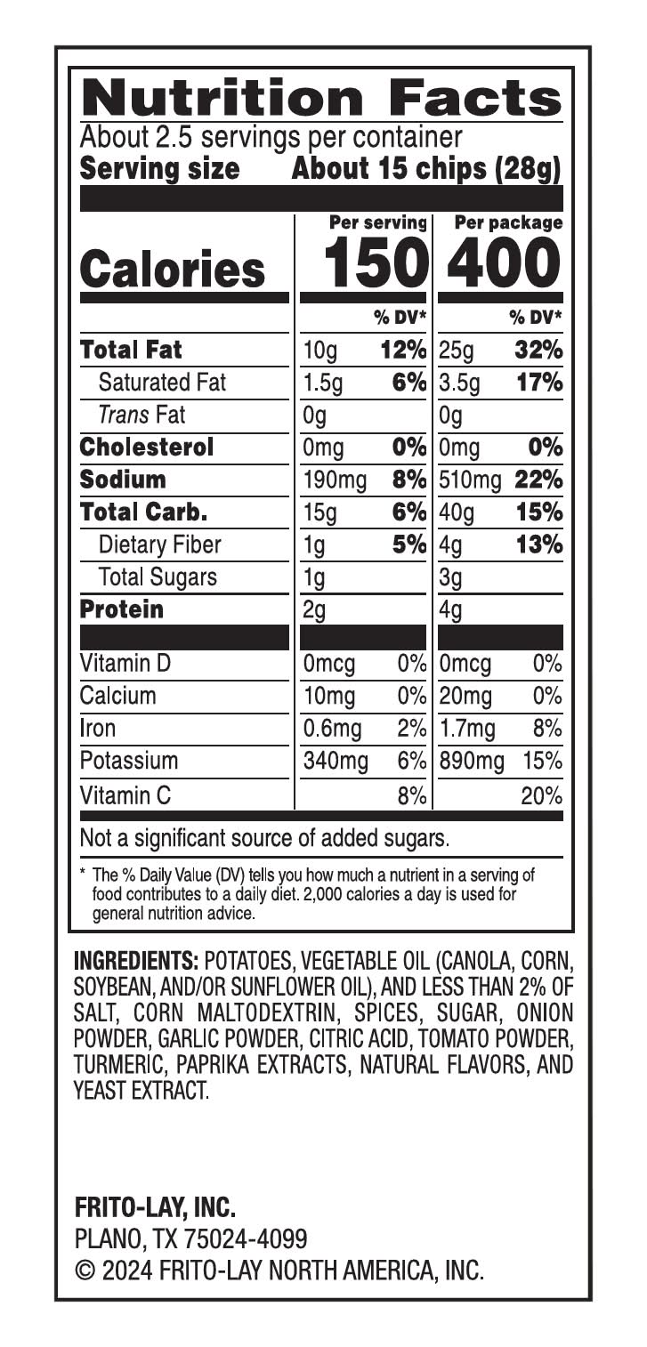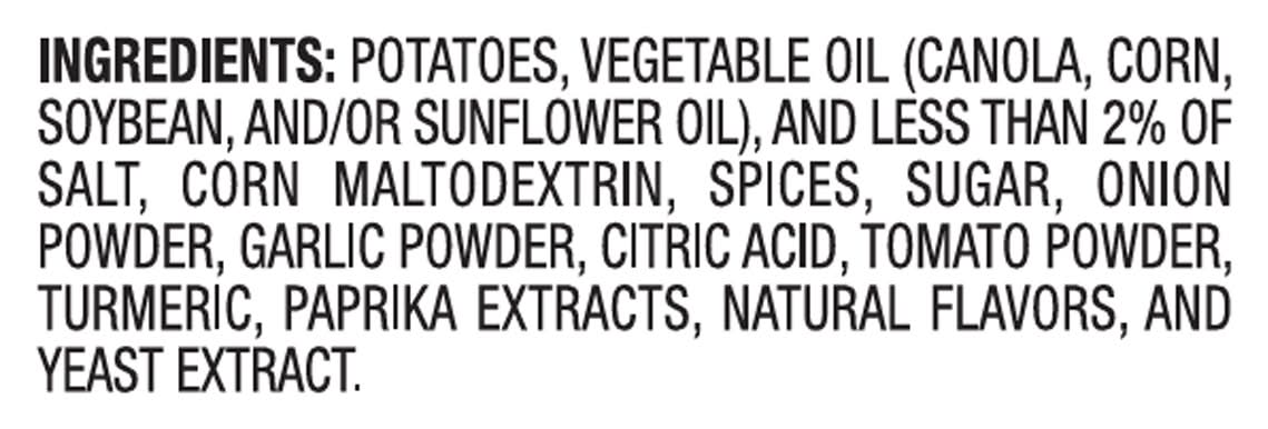 Ingredients: Potatoes, Vegetable Oil (Canola, Corn, Soybean, and/or Sunflower Oil), and Less than 2% of Salt, Corn Maltodextrin, Spices, Sugar, Onion Powder, Garlic Powder, Citric Acid, Tomato Powder, Turmeric, Paprika Extracts, Natural Flavors, and Yeast Extract Contains: Corn, Soybeans