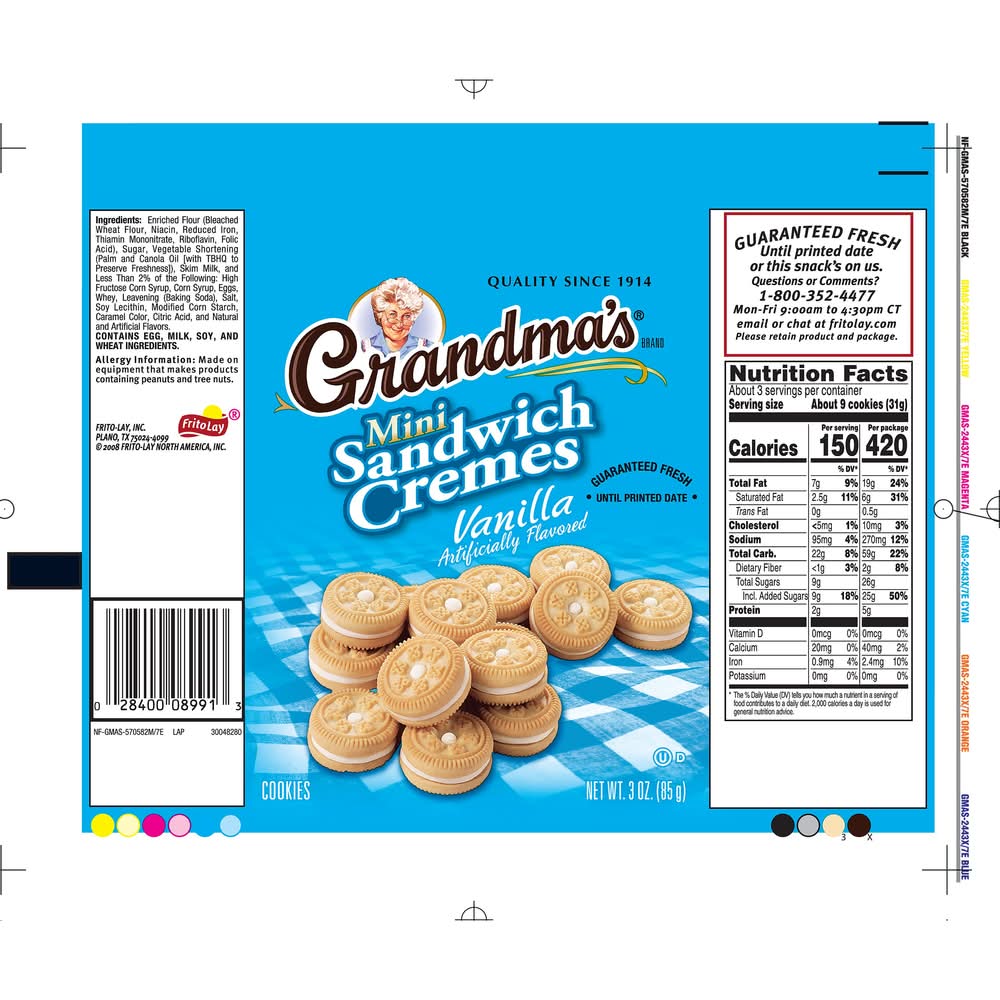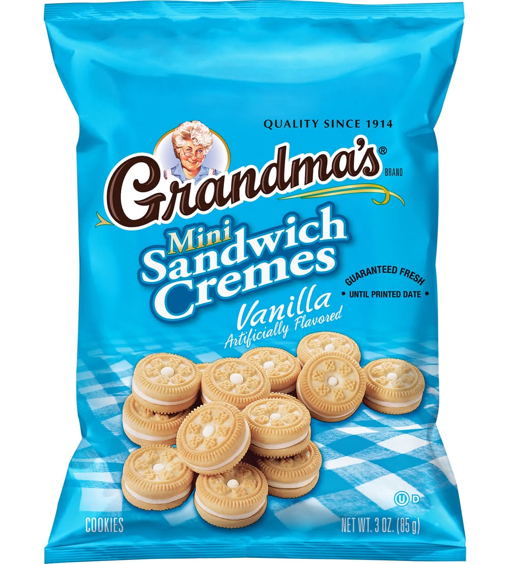 Grandma's Mini Sandwich Cremes Cookies offer a vanilla flavor and are artificially flavored. Inspired by homemade recipes, they are crafted to evoke nostalgic memories. Each cookie is made with care and is guaranteed fresh until the date printed on the package. Flavor: Vanilla