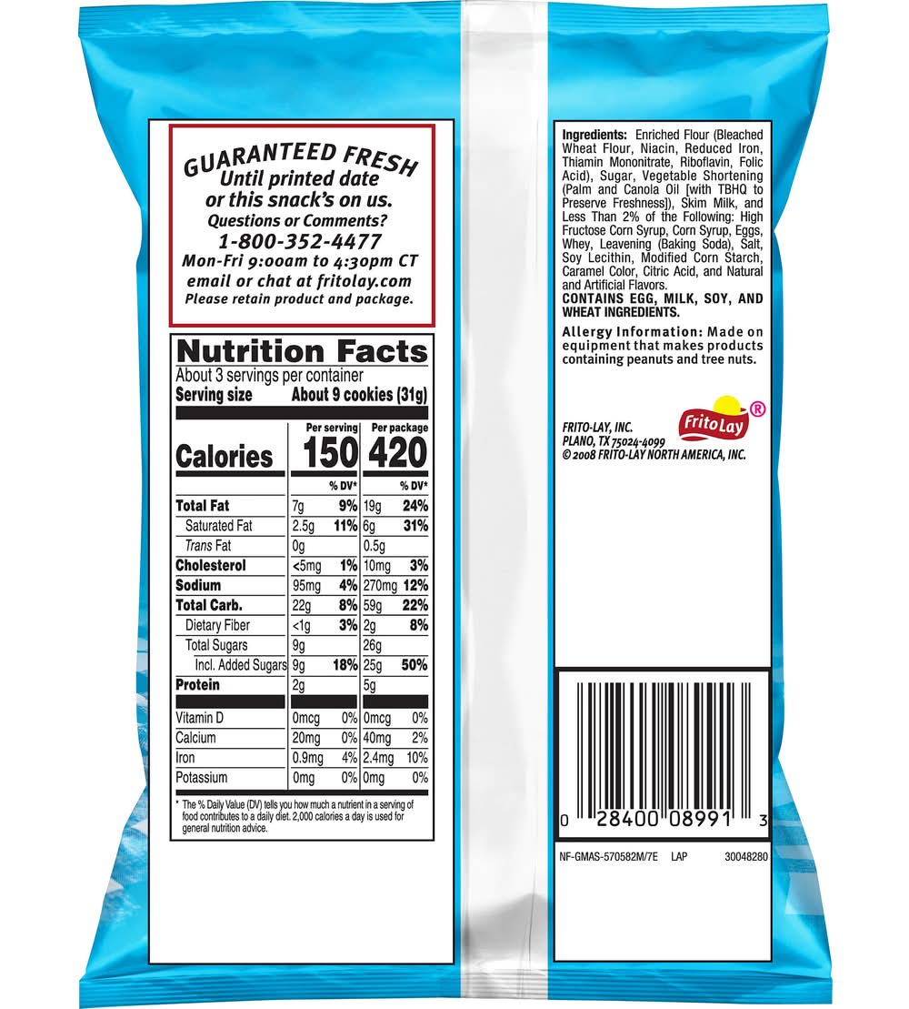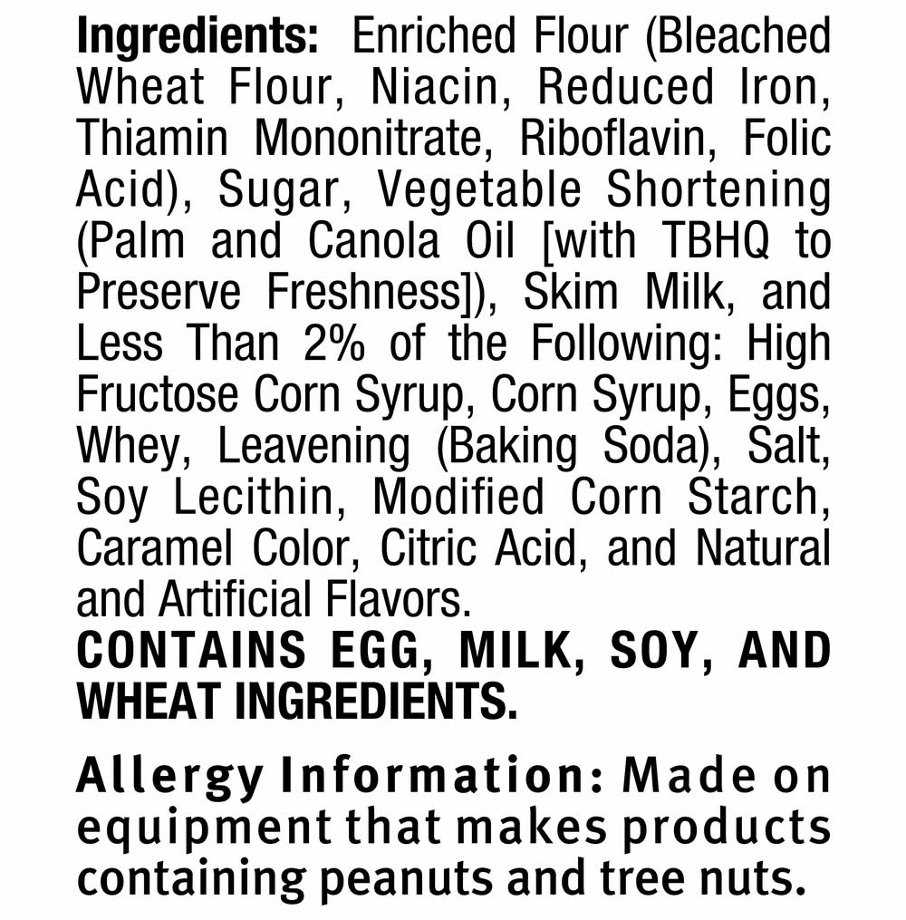 Ingredients: Enriched Flour (Bleached Wheat Flour, Niacin, Reduced Iron, Thiamin Mononitrate, Riboflavin, Folic Acid), Sugar, Vegetable Shortening (Palm And Canola Oil [With Tbhq To Preserve Freshness]), Skim Milk, High Fructose Corn Syrup, Corn Syrup, Eggs, Whey, Leavening (Baking Soda), Salt, Soy Lecithin, Modified Corn Starch, Caramel Color, Citric Acid, And Natural And Artificial Flavors. Contains Egg, Milk, Soy, Wheat Ingredients Contains: Eggs and their derivates, Milk and its derivates, Soybean and its Derivatives, Tree nuts and their derivatives, Peanuts and their derivates, Wheat and Their Derivatives