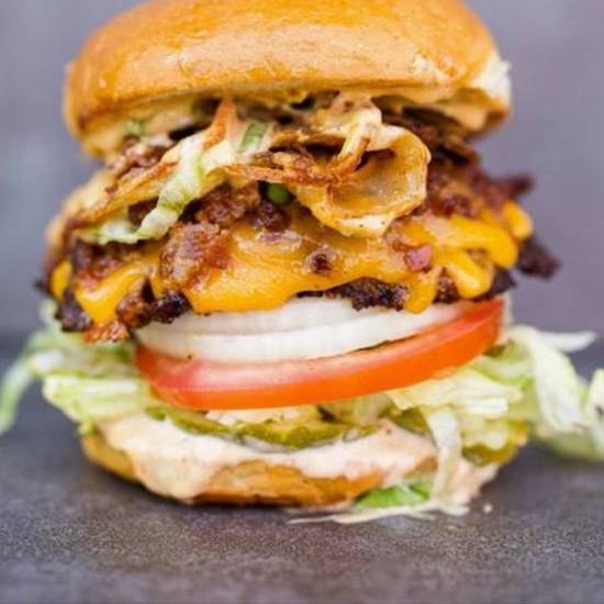 4 oz Smashed Patty | Brioche Bun | Cheddar Cheese | Bonehead Sauce | Maple Bacon | Crispy Onion Straws | Scallions | Lettuce | Tomato | Pickle | Raw Onion
