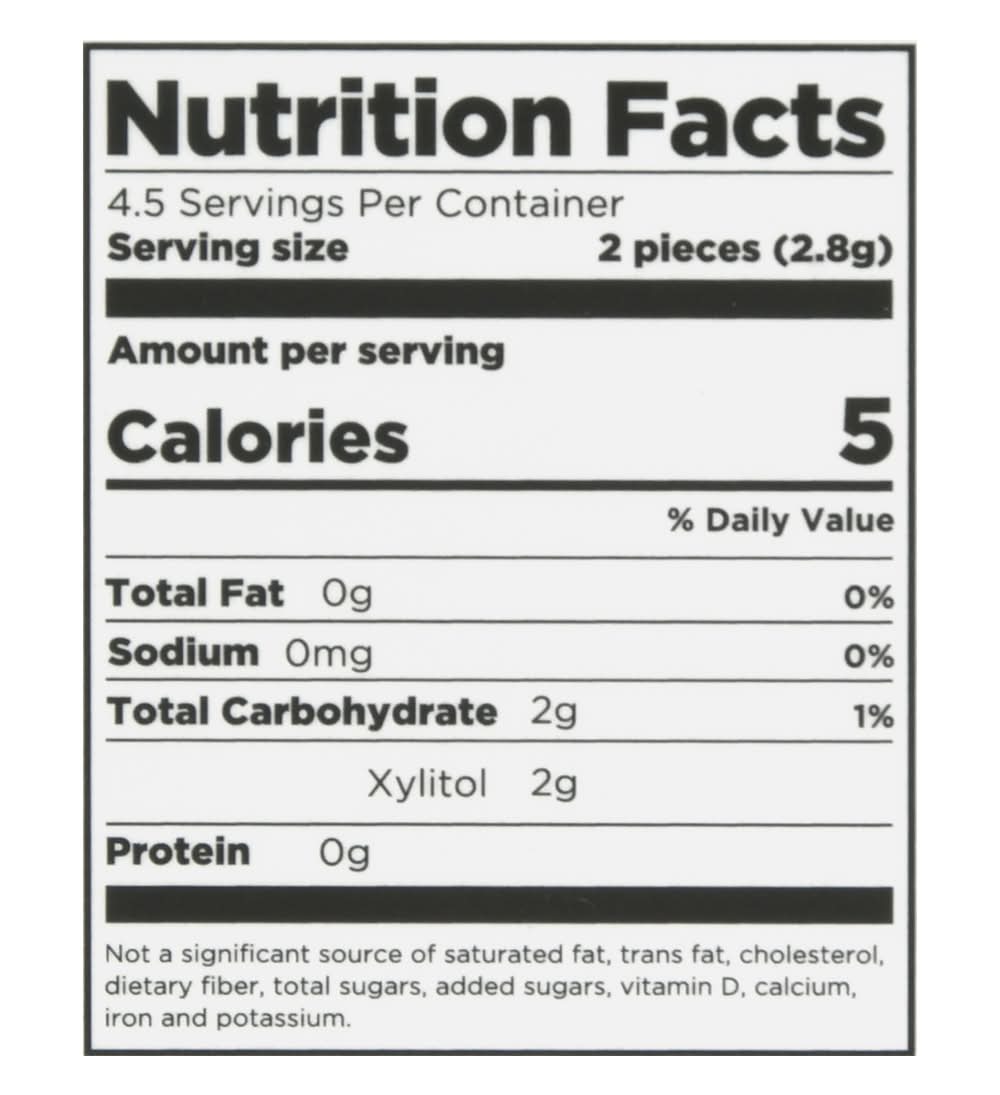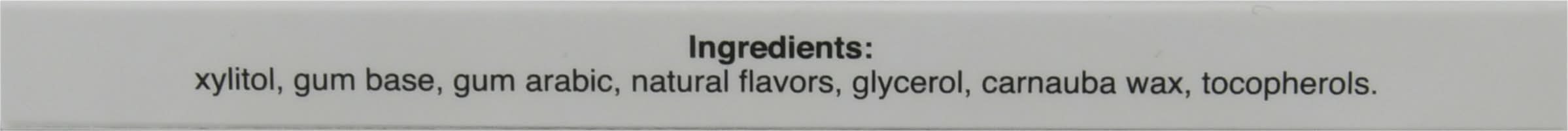 Ingredients: Xylitol, Gum Base, Gum Arabic, Natural Flavors, Glycerol, Carnauba Wax, Tocopherols