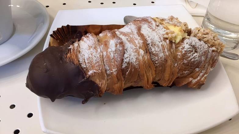 Flaky pastry filled with rich chocolate cream, dusted with powdered sugar, and partially dipped in chocolate.