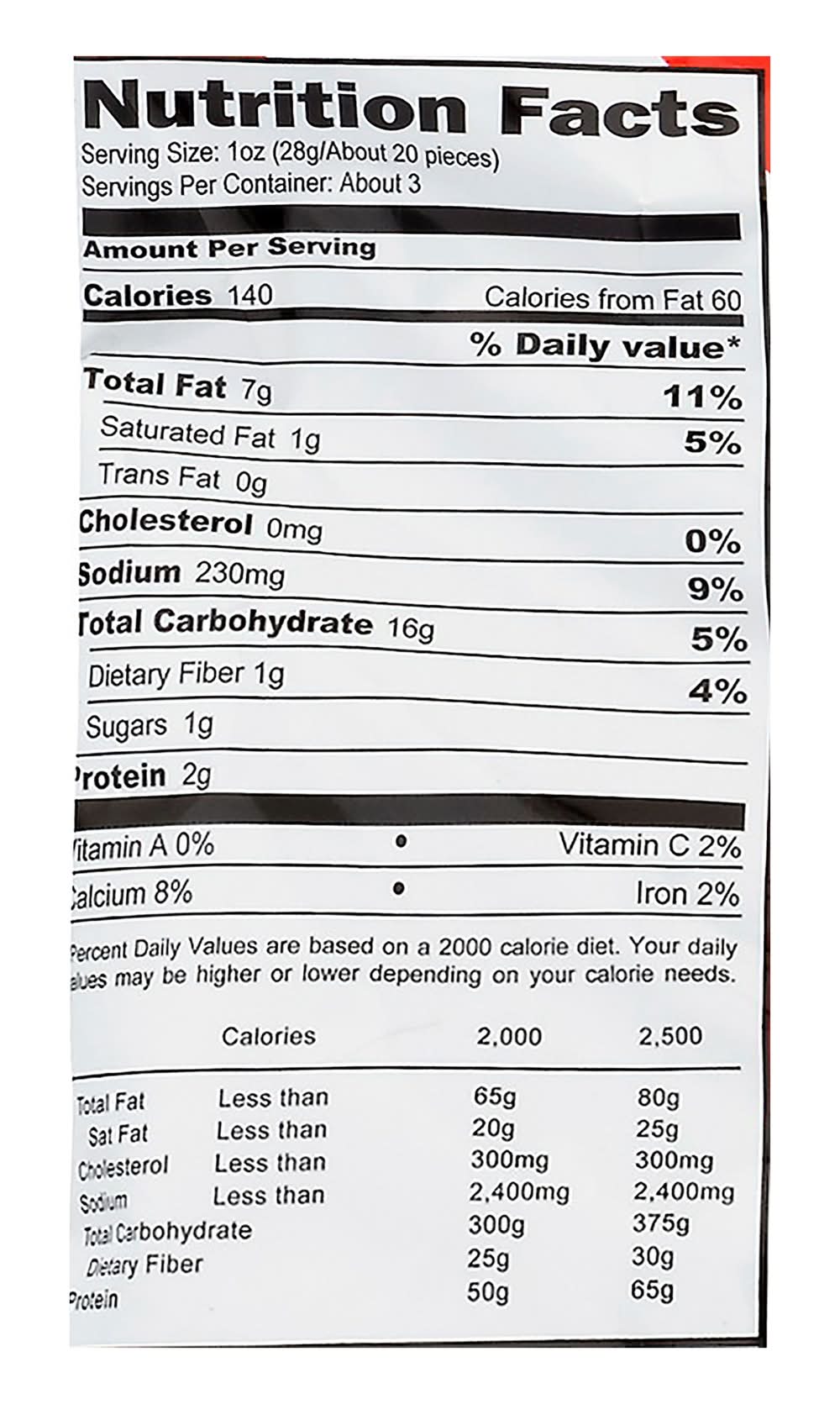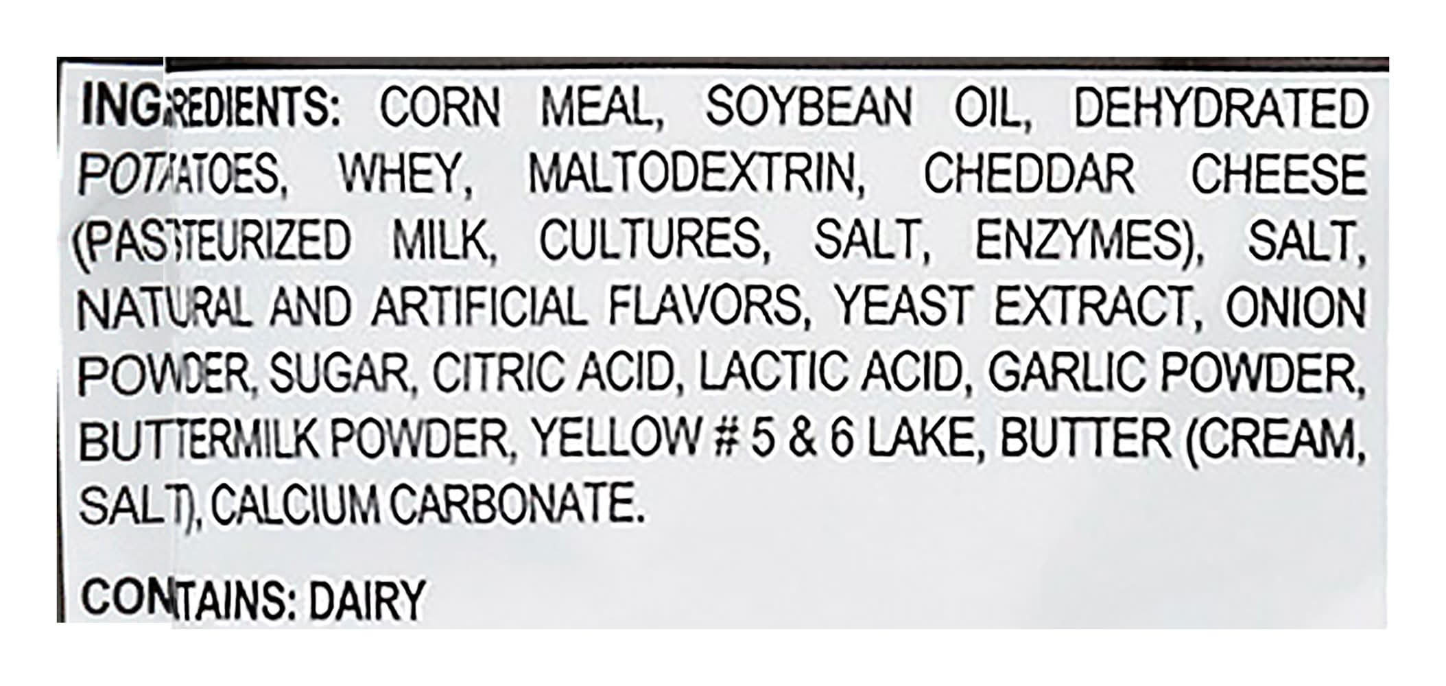 Ingredients: Corn Meal, Soybean Oil, Dehydrated Potatoes, Whey, Maltodextrin, Cheddar Cheese (Pasteurized Milk, Cultures, Salt, Enzymes), Salt, Enzymes), Salt, Natural and Artificial Flavors, Yeast Extract, Onion Powder, Sugar, Citric Acid, Lactic Acid, Garlic Powder, Buttermilk Powder, Yellow 5 and 6 Lake, Butter (Cream, Salt), Calcium Carbonate. Contains: Milk, Soybeans