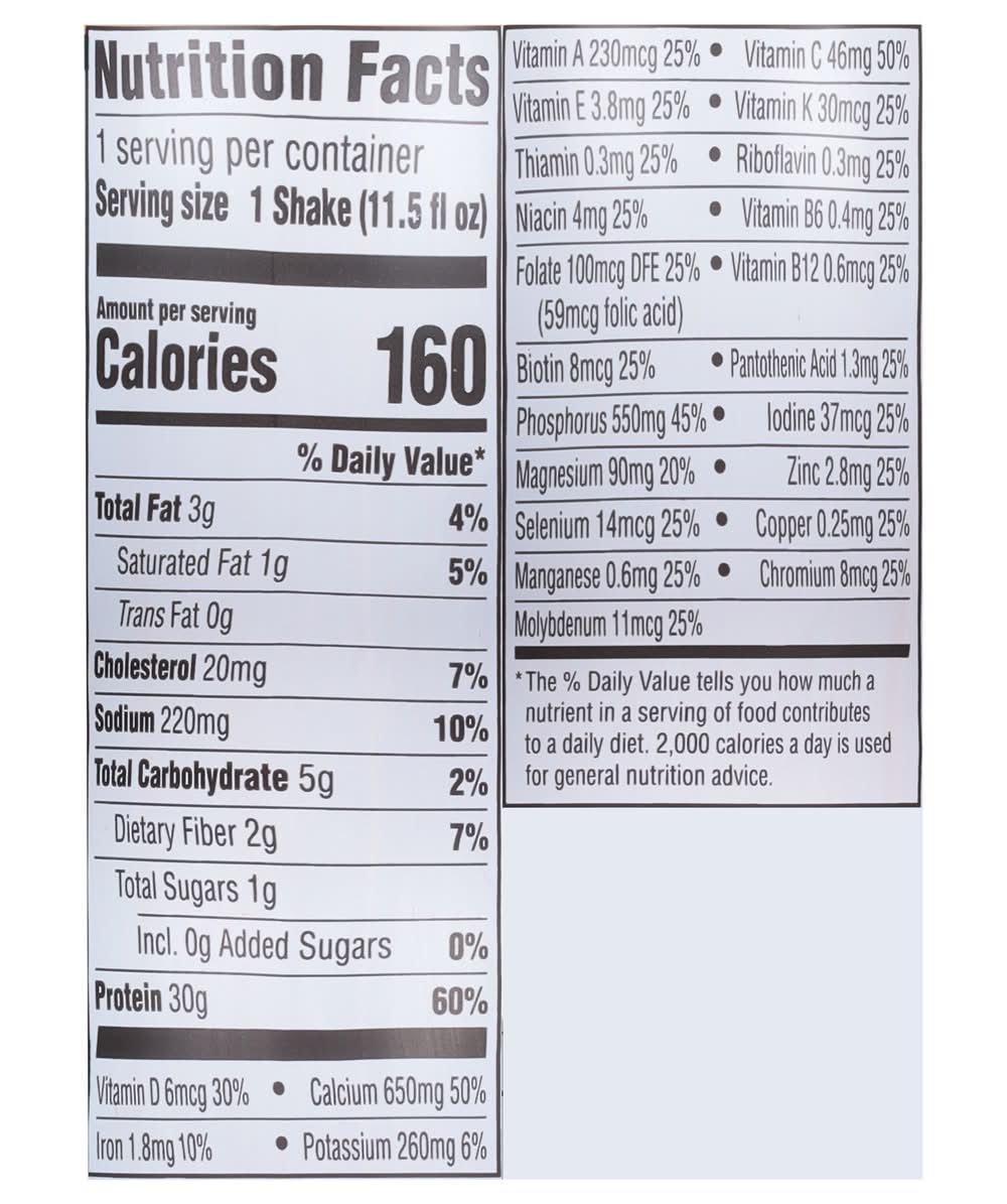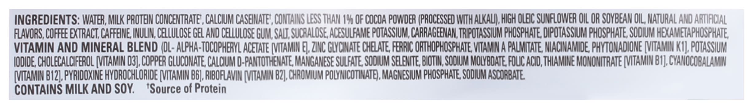 Ingredients: Water, Milk Protein Concentrate(a), Calcium Caseinate(a), Contains Less than 1% of Cocoa Powder (Processed with Alkali), High Oleic Sunflower Oil or Soybean Oil, Natural and Artificial Flavors, Coffee Extract, Caffeine, Inulin, Cellulose Gel and Cellulose Gum, Salt, Sucralose, Acesulfame Potassium, Carrageenan, Tripotassium Phosphate, Dipotassium Phosphate, Sodium Hexametaphosphate, Vitamin and Mineral Blend (DL-Alpha-Tocopheryl Acetate [Vitamin E], Zinc Glycinate Chelate, Ferric Orthophosphate, Vitamin A Palmitate, Niacinamide, Phytonadione [Vitamin K1], Potassium Iodide, Cholecalciferol [Vitamin D3], Copper Gluconate, Calcium D-Pantothenate, Manganese Sulfate, Sodium Selenite, Biotin, Sodium Molybdate, Folic Acid, Thiamine Mononitrate [Vitamin B1], Cyanocobalamin [Vitamin B12], Pyridoxine Hydrochloride [Vitamin B6], Riboflavin [Vitamin B2], Chromium Polynicotinate), Magnesium Phosphate, Sodium Ascorbate. (a) Source of Protein Contains: Milk, Soybeans
