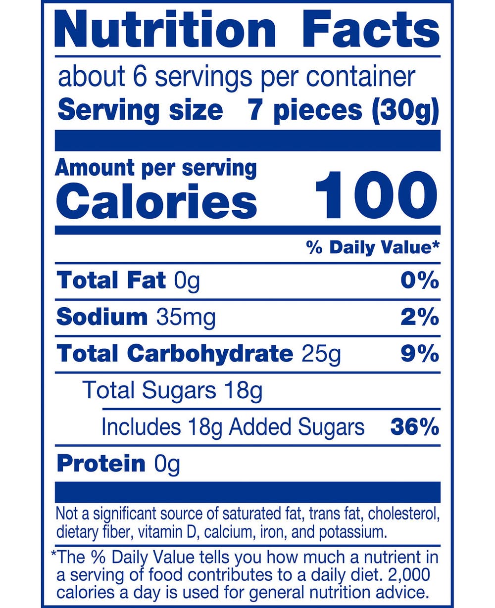 Ingredients: SUGAR, CORN SYRUP, MODIFIED CORNSTARCH, CONTAINS 2% OR LESS OF: MALIC ACID, SODIUM CITRATE, NATURAL ARTIFICIAL FLAVOR, MINERAL OIL, CARNAUBA WAX, ARTIFICIAL COLOR (RED 40, BLUE 1), . Contains: Contains: Does Not Contain Any Of The 8 Major Allergens