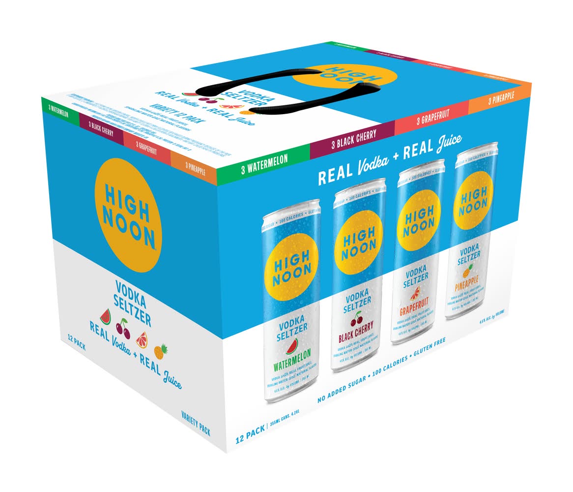The real fruit juice, sparkling water & natural flavors. 100 calories. Gluten free. No added sugar. Real vodka + real juice. The easy-drinking, always socializing, great-tasting, sun-toasting, blue sky celebrating, memory-making - awesomeness in a can - hard seltzer. Get out and enjoy! 4.5% Alc. by vol. 9 Produced for High Noon Spirits Company, Modesto, CA. • Flavor: Assorted • Pack size: 12 • Alcohol by volume: 4.5% • Packaging: Reusable