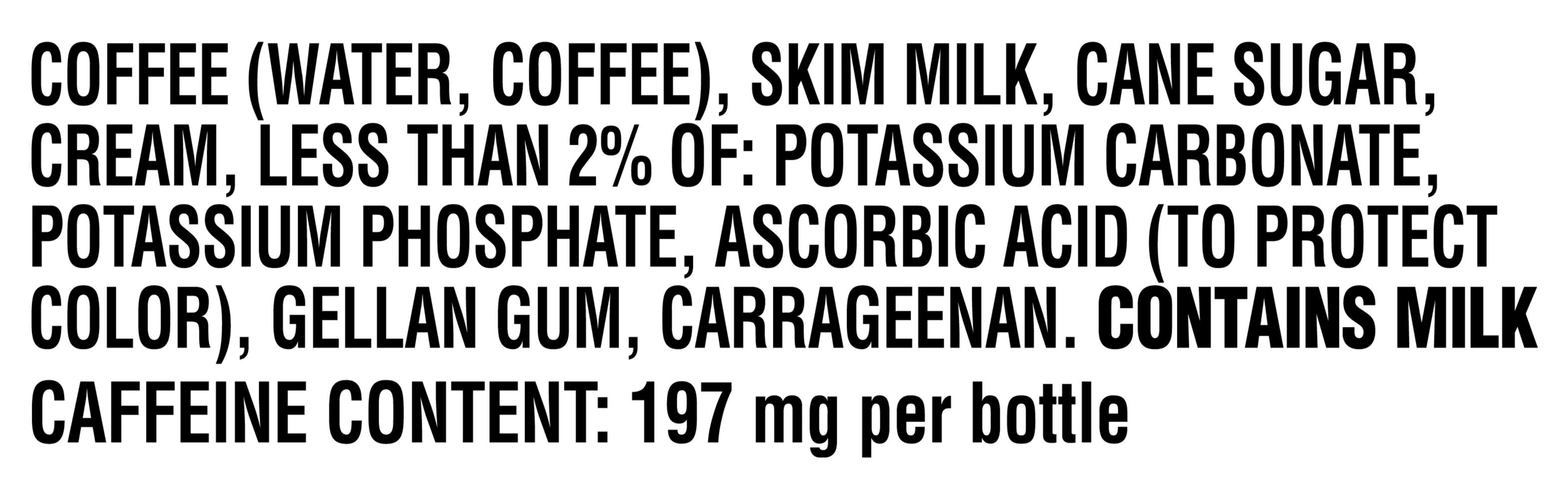 Ingredients: Ingredients: Coffee (Water, Coffee), Skim Milk, Cane Sugar, Cream, Less Than 2% Of: Potassium Carbonate, Potassium Phosphate, Ascorbic Acid (To Protect Color), Gellan Gum, Carrageenan. Contains: Contains milk