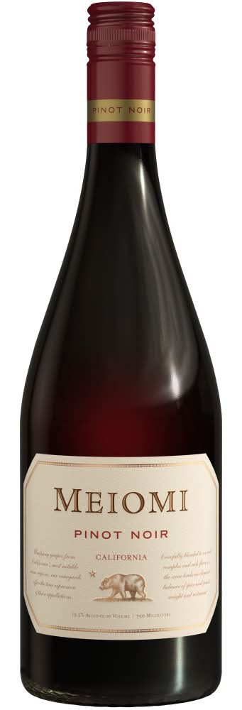 Unifying grapes from California's most notable wine growing regions, our Pinot Noir vineyards offer the true expression of their respective appellations. Carefully blended to achieve balance, complexity, and richness of flavor. With a soft hand in the cellar and gentle winemaking techniques, the wine evolves into an elegant balance of spice and fruit, weight and restraint. Meiomi (May-OH-mee), meaning coast, truly symbolizes the origin of this Pinot Noir, which embodies the characters of California's most notable wine growing regions. Lifted aromas of jammy fruit and toasty oak are followed by expressive dark berry, juicy strawberry, and toasty mocha flavors. With a soft, plush palate, the well-integrated oak provides a unique structure and depth seldom seem in Pinot Noir. The wines are carefully crafted so that these characteristics continue to enhance and build on each other for an evocative and memorable Pinot Noir. 13.5% alc./vol. 27 Vinted & bottled by Meiomi Wines, Acampo, CA. • Alcohol by volume: 13.5% • 2022