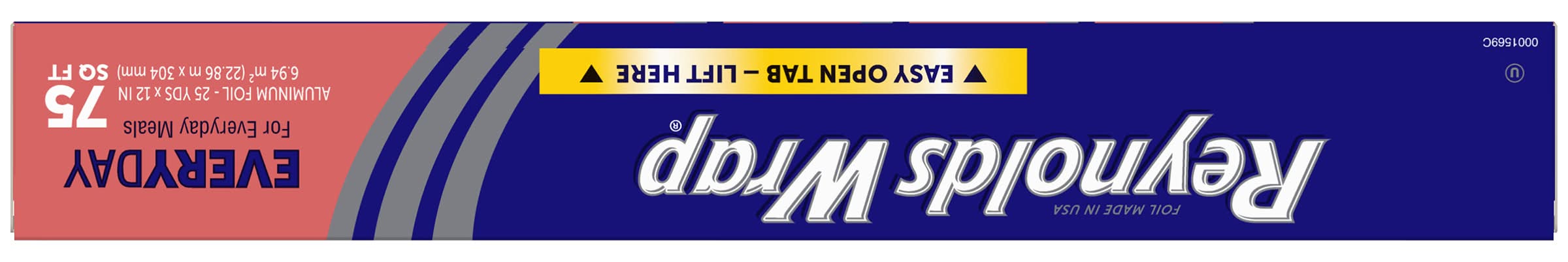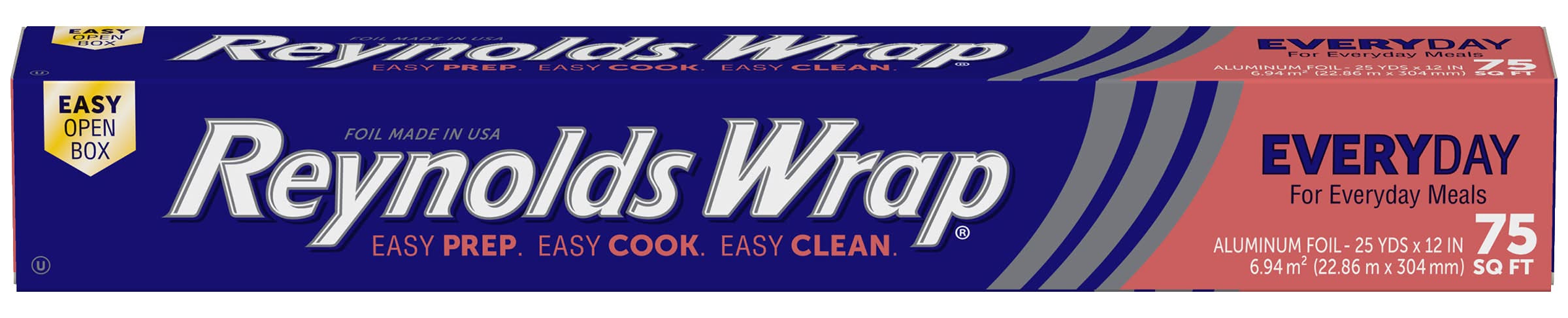 Foil is designed to assist in various stages of food preparation and preservation. It can line baking pans and sheets to simplify cleanup and is suitable for wrapping food to retain flavor and moisture during roasting or baking. The product features an Easy Tear Edge for convenient dispensing and contributes to protecting leftovers from freezer burn. Additionally, Aluminum Foil can be utilized for creating foil packets that facilitate effortless, savory meals either in the oven or on the grill. It is also adaptable for craft activities. • Brand: Reynolds • Size: 22.86 m x 304 mm • Reynolds Consumer Products, 1900 W. Field Court,Lake Forest,IL,60045 • Packaging: Reusable