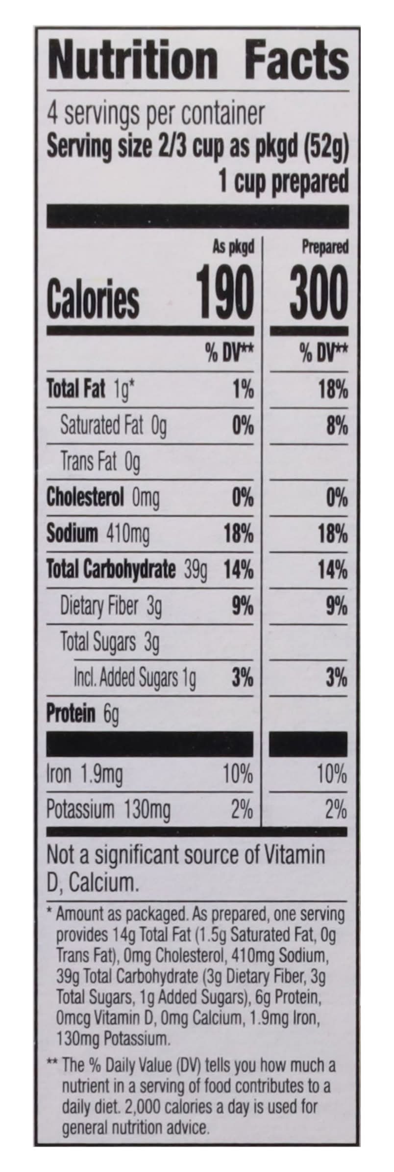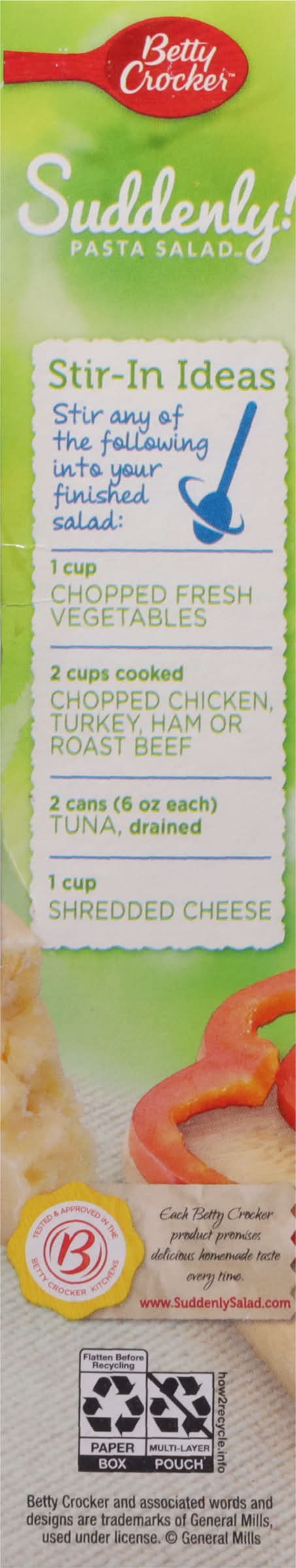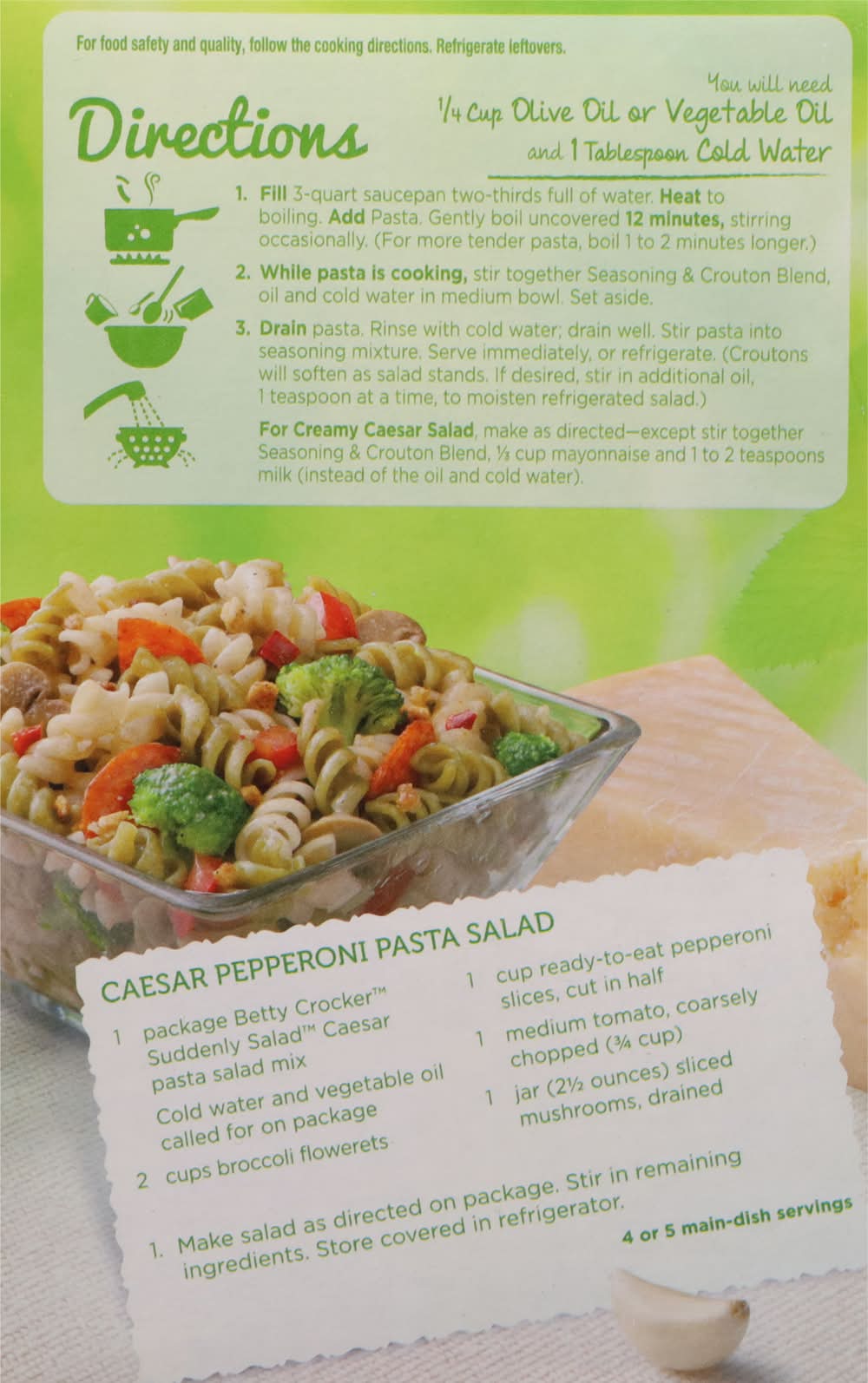 Pasta, red peppers, croutons & seasoning. Per 2/3 Cup as Packaged: 190 calories; 0 g sat fat (0% DV); 410 mg sodium (18% DV); 3 g total sugars. See nutrition facts for as prepared information. Contains bioengineered food ingredients. Make it your own. Tested & Approved in the Betty Crocker Kitchens: Each Betty Crocker product promises delicious homemade taste every time. • Flavor: Caesar • Packaging: Reusable