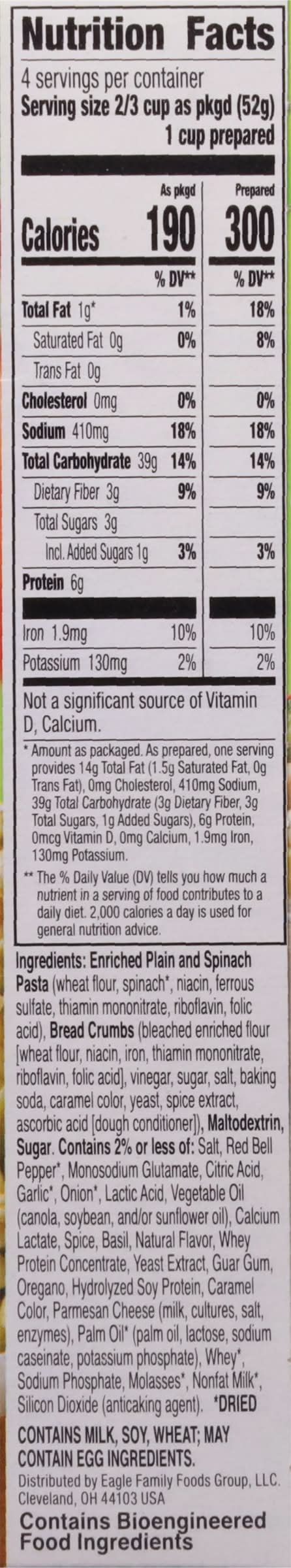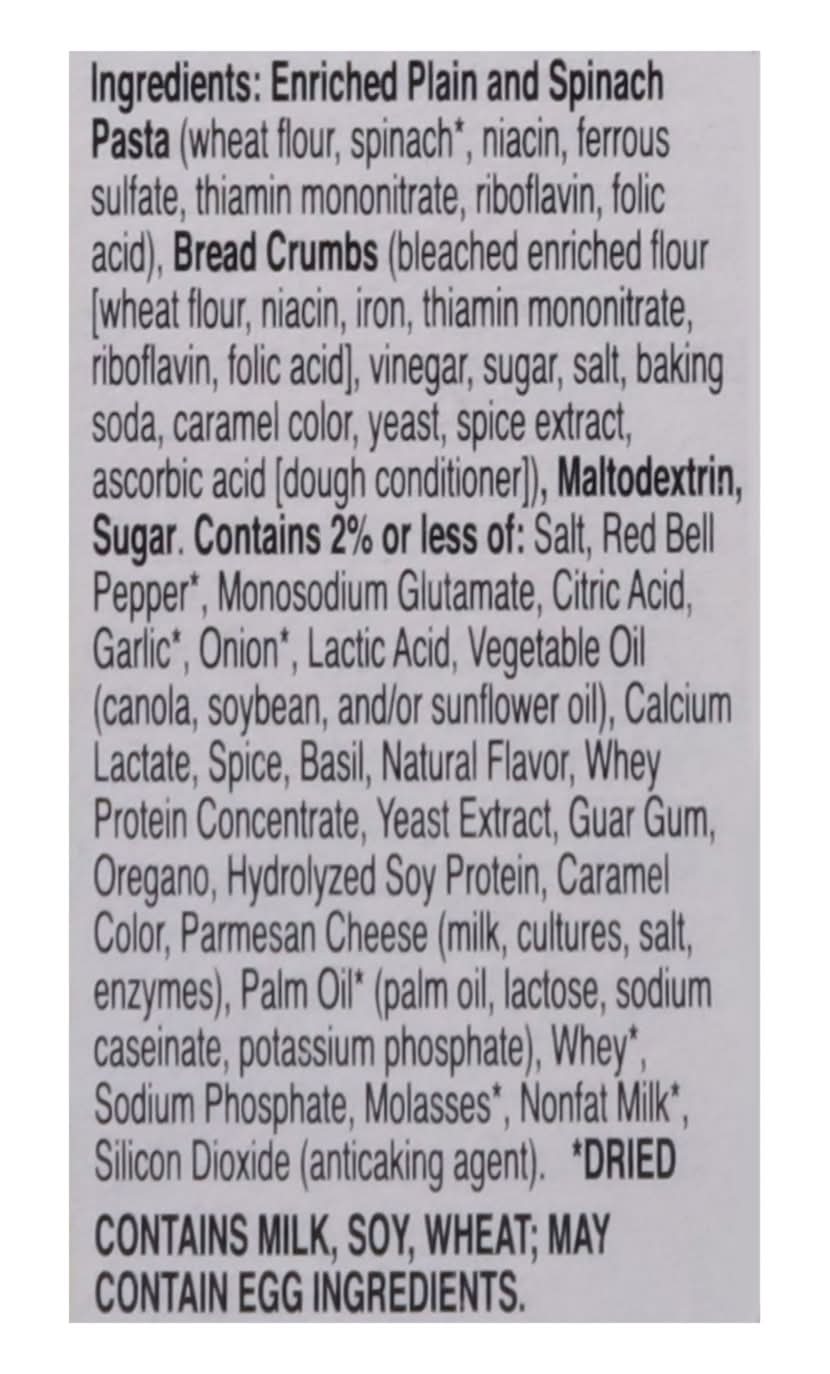 Ingredients: Enriched Plain and Spinach Pasta (Wheat Flour, Spinach (Dried), Niacin, Ferrous Sulfate, Thiamin Mononitrate, Riboflavin, Folic Acid), Bread Crumbs (Bleached Enriched Flour [Wheat Flour, Niacin, Iron, Thiamin Mononitrate, Riboflavin, Folic Acid], Vinegar, Sugar, Salt, Baking Soda, Caramel Color, Yeast, Spice Extract, Ascorbic Acid [Dough Conditioner]), Maltodextrin, Sugar, Contains 2% or Less of: Salt, Red Bell Pepper (Dried), Monosodium Glutamate, Citric Acid, Garlic (Dried), Onion (Dried), Lactic Acid, Vegetable Oil (Canola, Soybean, and/or Sunflower Oil), Calcium Lactate, Spice, Basil, Natural Flavor, Whey Protein Concentrate, Yeast Extract, Guar Gum, Oregano, Hydrolyzed Soy Protein, Caramel Color, Parmesan Cheese (Milk, Cultures, Salt, Enzymes), Palm Oil (Dried) (Palm Oil, Lactose, Sodium Caseinate, Potassium Phosphate), Whey (Dried), Sodium Phosphate, Molasses (Dried), Nonfat Milk (Dried), Silicon Dioxide (Anticaking Agent) Contains: Wheat, Soybeans, Milk, Lactose, Eggs