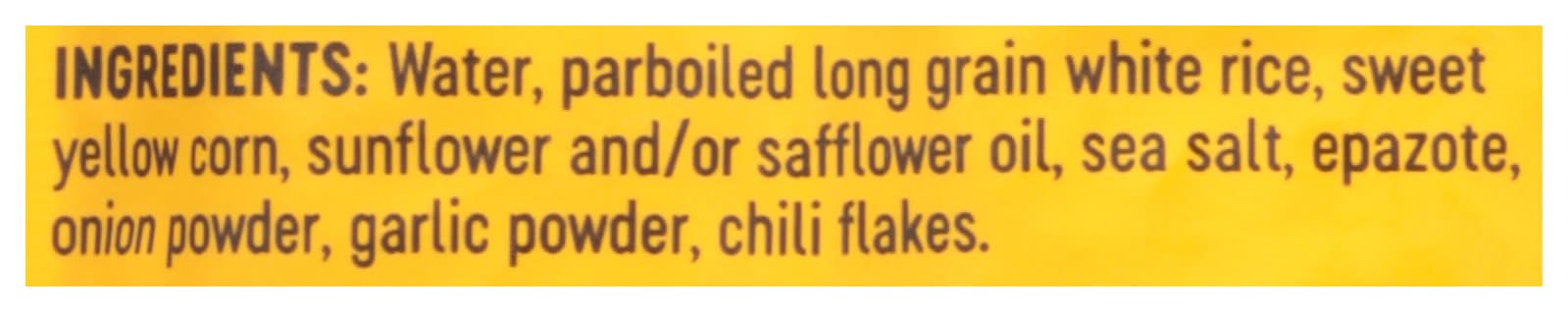 Ingredients: Water, Parboiled Long Grain White Rice, Sweet Yellow Corn, Sunflower and/or Safflower Oil, Sea Salt, Epazote, Onion Powder, Garlic Powder, Chili Flakes Contains: Corn