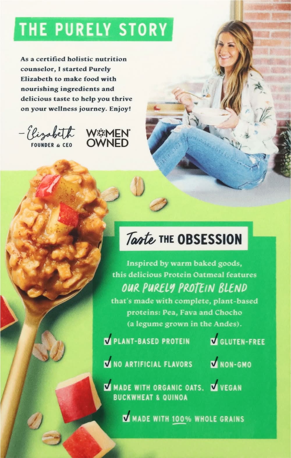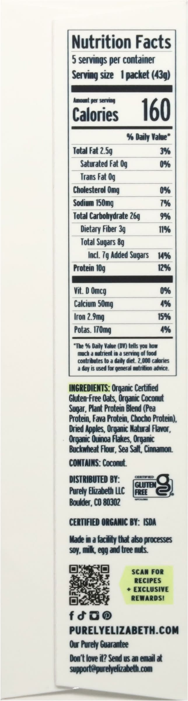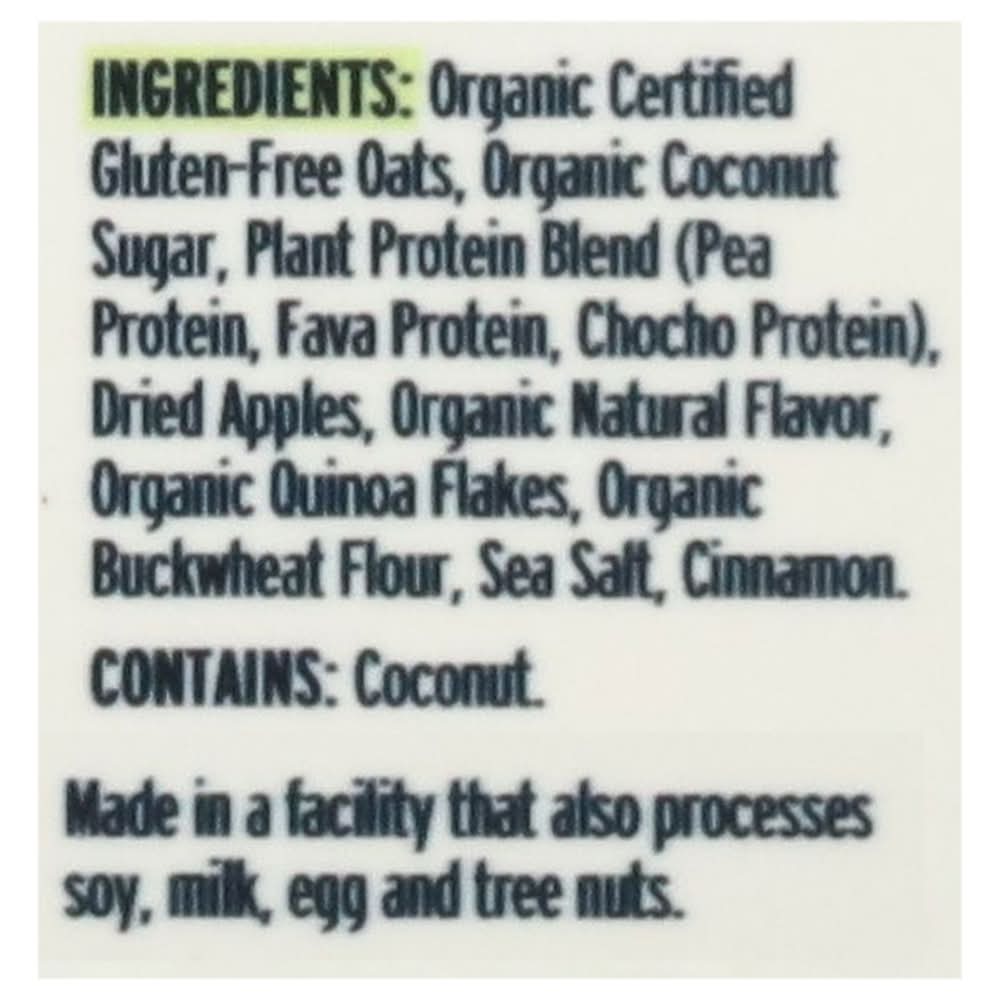 Ingredients: Organic Certified Gluten-Free Oats, Organic Coconut Sugar, Plant Protein Blend (Pea Protein, Fava Protein, Chocho Protein), Dried Apples, Organic Natural Flavor, Organic Quinoa Flakes, Organic Buckwheat Flour, Sea Salt, Cinnamon Contains: Tree Nuts, Coconuts, Oat, Soybeans, Milk, Eggs, Tree Nuts