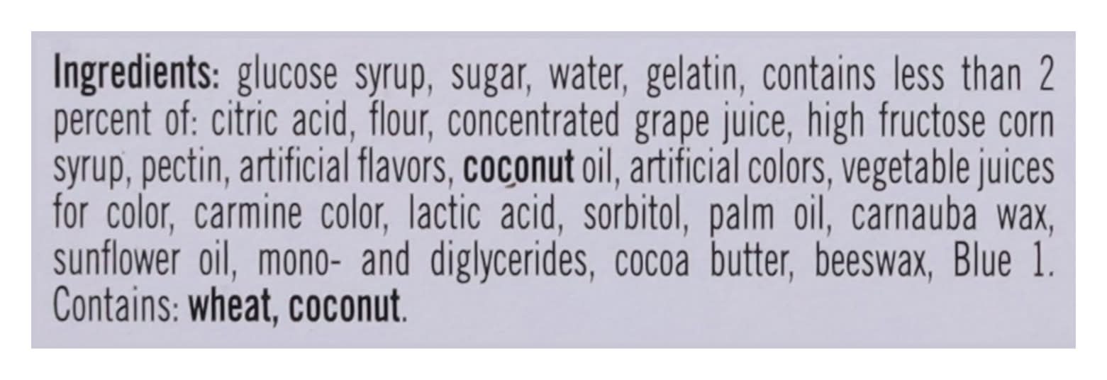 Ingredients: Glucose Syrup, Sugar, Water, Gelatin, Contains Less than 2 Percent of: Citric Acid, Flour, Concentrated Grape Juice, High Fructose Corn Syrup, Pectin, Artificial Flavors, Coconut Oil, Artificial Colors, Vegetable Juices for Color, Carmine Color, Lactic Acid, Sorbitol, Palm Oil, Carnauba Wax, Sunflower Oil, Mono- and Diglycerides, Cocoa Butter, Beeswax, Blue 1 Contains: Wheat, Tree Nuts, Coconuts