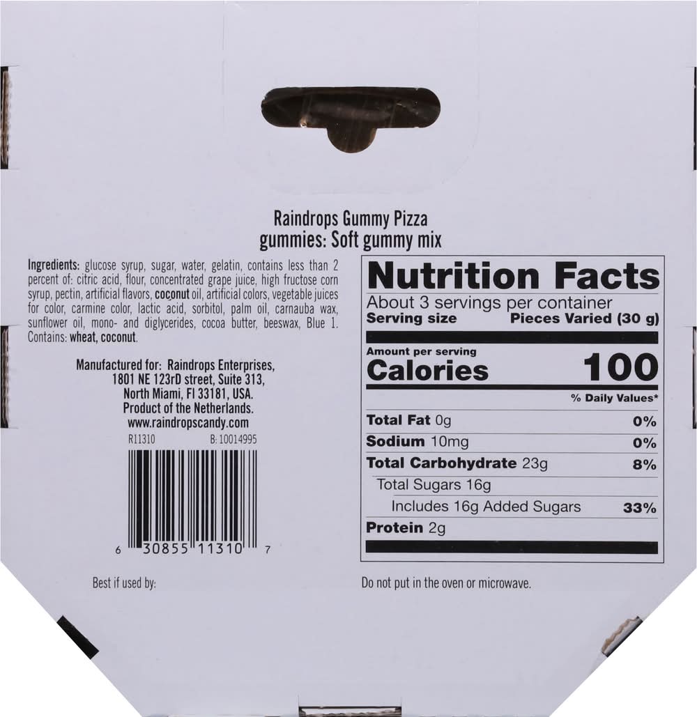 Pizza Gummy • Number of servings: 3 • Raindrops Enterprises, North Miami, FL, 33181, Ph: 800-354-2263.