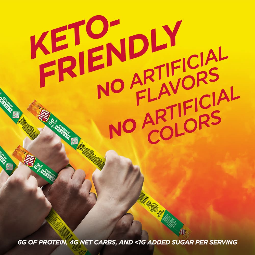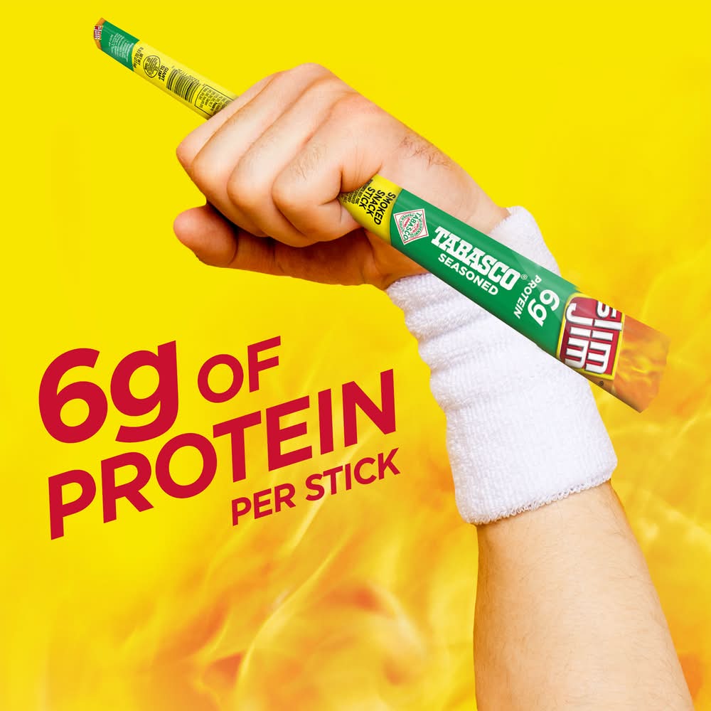 Experience intense, flavor with delicious Giant Sized Tabasco Snack Sticks. Made with spicy beef, pork and chicken, these snack sticks contain no artificial flavors or colors for an epic tabasco flavor everyone can love. Each meat stick serving is loaded with 6 grams of protein, ideal for protein snacks that kick hunger to the curb and leave you feeling satisfied. These individually wrapped snacks go where you go and are perfect as travel snacks, school snacks or anywhere meat snacks. Snack Sticks offer a bold and tasty way to take on the day. Each of the individual snacks is perfect for on-the-go snacking, so you are ready to hit back when savory cravings hit. Slim Jim keeps it interesting with a full line of beef sticks, snack sticks, pork rinds and jerky.! Flavor: Tabasco