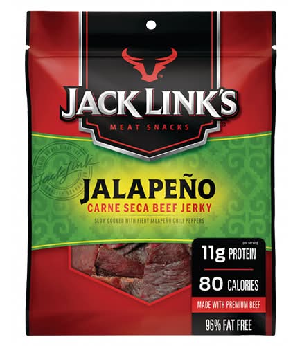 Jack Link's Jalapeno Carne Seca Beef Jerky (3.25oz bag) is a type of beef jerky that combines the bold flavors of jalapeno and roasted chili peppers. It is seasoned with fiery jalapeno and chili peppers, then slow cooked and smoked over genuine mesquite. This product is inspected and passed by the Department of Agriculture, ensuring its quality. It is marketed as a wholesome and nutritious snack, an excellent source of protein, and contains zero grams of trans fat per serving. Additionally, it is 97% fat free. The family name on the package represents a guarantee of satisfaction.