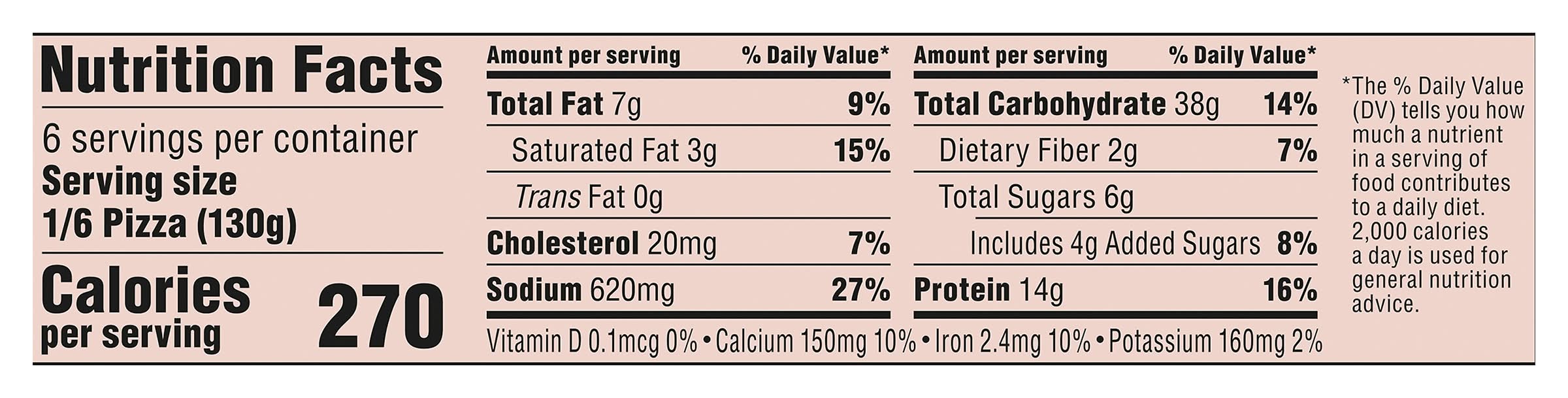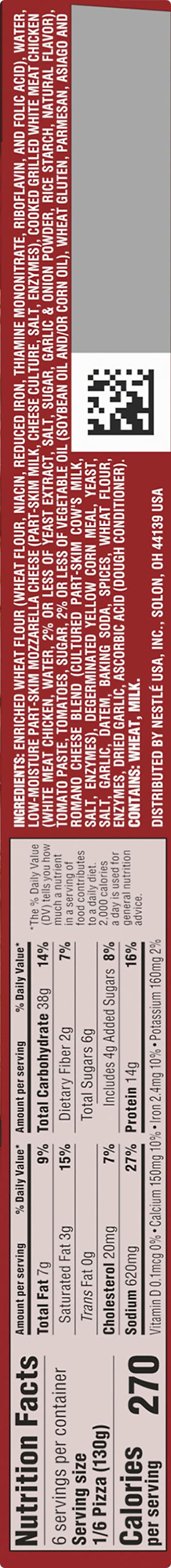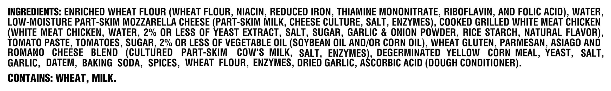 Ingredients: Enriched Wheat Flour (Wheat Flour, Niacin, Reduced Iron, Thiamine Mononitrate, Riboflavin, and Folic Acid), Water, Low-Moisture Part-Skim Mozzarella Cheese (Part-Skim Milk, Cheese Culture, Salt, Enzymes), Cooked Grilled White Meat Chicken (White Meat Chicken, Water, 2% or Less of Yeast Extract, Salt, Sugar, Garlic & Onion Powder, Rice Starch, Natural Flavor), Tomato Paste, Tomatoes, Sugar, 2% or Less of Vegetable Oil (Soybean Oil and/or Corn Oil), Wheat Gluten, Parmesan, Asiago and Romano Cheese Blend (Cultured Part-Skim Cow's Milk, Salt, Enzymes), Degerminated Yellow Corn Meal, Yeast, Salt, Garlic, DATEM, Baking Soda, Spices, Wheat Flour, Enzymes, Dried Garlic, Ascorbic Acid (Dough Conditioner) Contains: Wheat, Milk, Soybeans, Gluten