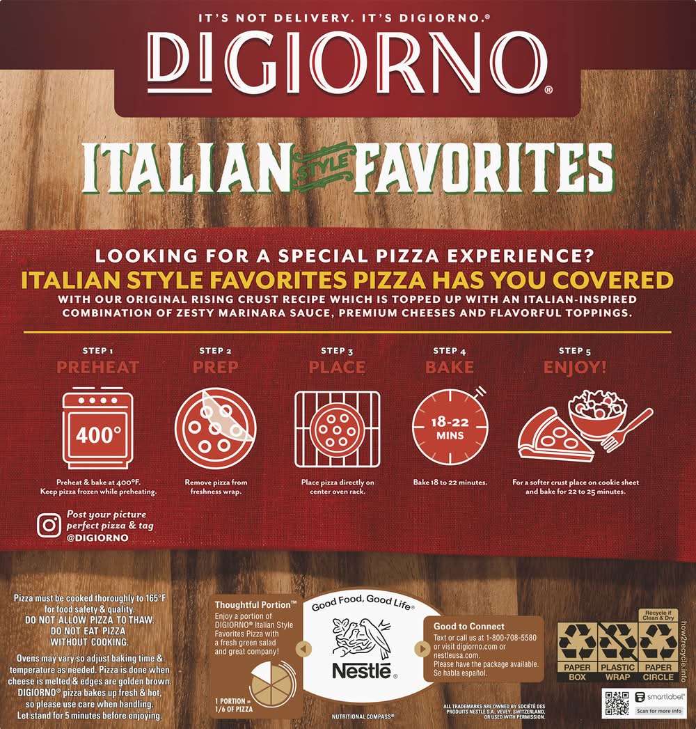 Directions for use: Directions: Cook thoroughly. Step 1 Preheat: Preheat & bake at 400 degrees F. Keep pizza frozen while preheating. Step 2 Prep: Prep remove pizza from freshness wrap. Step 3 Place: Pizza directly on the center rack. Step 4 Bake: Bake 18 to 22 minutes. Step 5 Enjoy: For a softer crust place on cookie sheet and bake for 22 to 25 minutes. Pizza must be cooked thoroughly to 165 degrees F for food safety & quality. Do not allow pizza to thaw. Do not eat pizza without cooking. Ovens may vary so adjust baking time & temperature as needed. Pizza is done when cheese is melted & edges are golden brown. Digiorno pizza bakes up fresh & hot, so please use care when handling. Let stand for 5 minutes before enjoying. Thoughtful Portion: Enjoy a portion of Digiorno Italian style favorites pizza with a fresh green salad and great company! 1 Portion = 1/6 of pizza. Keep frozen. Not ready to eat. Storage recommendation: Keep frozen.