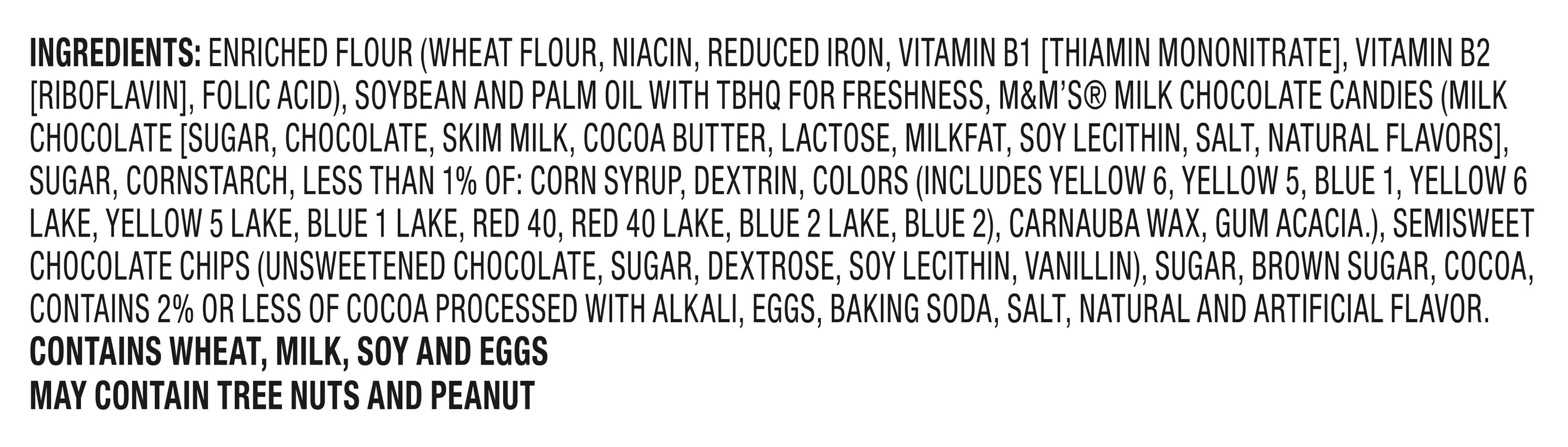 Ingredients: Enriched Flour (Wheat Flour, Niacin, Reduced Iron, Vitamin B1 [Thiamin Mononitrate], Vitamin B2 [Riboflavin], Folic Acid), Soybean and Palm Oil with TBHQ for Freshness, M&M's Milk Chocolate Candies (Milk Chocolate [Sugar, Chocolate, Skim Milk, Cocoa Butter, Lactose, Milkfat, Soy Lecithin, Salt, Natural Flavors], Sugar, Cornstarch, Less than 1% of: Corn Syrup, Dextrin, Colors (Includes Yellow 6, Yellow 5, Blue 1, Yellow 6 Lake, Yellow 5 Lake, Blue 1 Lake, Red 40, Red 40 Lake, Blue 2 Lake, Blue 2), Carnauba Wax, Gum Acacia, ), Semisweet Chocolate Chips (Unsweetened Chocolate, Sugar, Dextrose, Soy Lecithin, Vanillin), Sugar, Brown Sugar, Cocoa, Contains 2% or Less of Cocoa Processed with Alkali, Eggs, Baking Soda, Salt, Natural and Artificial Flavor Contains: Wheat, Milk, Soybeans, Eggs, Corn, Lactose, Tree Nuts, Peanuts