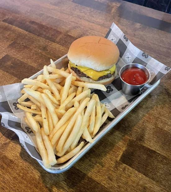 All beef patty with cheddar cheese, Ketchup, and mustard. Comes with fries, tots, or apple sauce, and choice of soda.