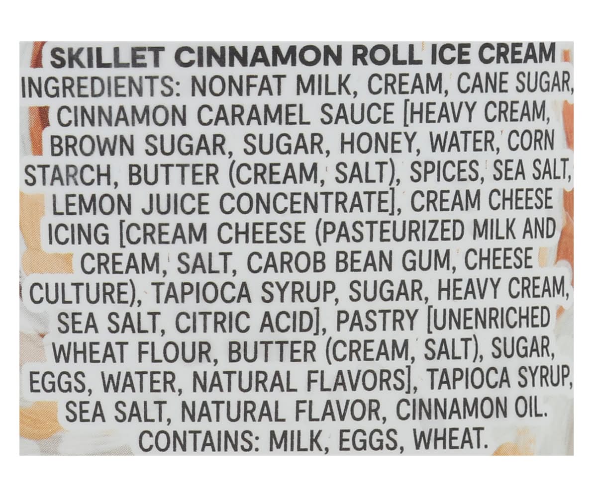 Ingredients: Nonfat Milk, Cream, Cane Sugar, Cinnamon Caramel Sauce [Heavy Cream, Brown Sugar, Sugar, Honey, Water, Corn Starch, Butter (Cream, Salt), Spices, Sea Salt Lemon Juice Concentrate], Cream Cheese Icing [Cream Cheese (Pasteurized Milk and Cream, Salt, Carob Bean Gum, Cheese Culture), Tapioca Syrup, Sugar, Heavy Cream, Sea Salt, Citric Acid], Pastry [Unenriched Wheat Flour, Butter (Cream, Salt), Sugar, Eggs, Water, Natural Flavors], Tapioca Syrup Sea Salt, Natural Flavor, Cinnamon Oil Contains: Milk, Eggs, Wheat