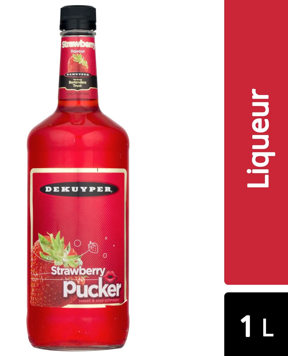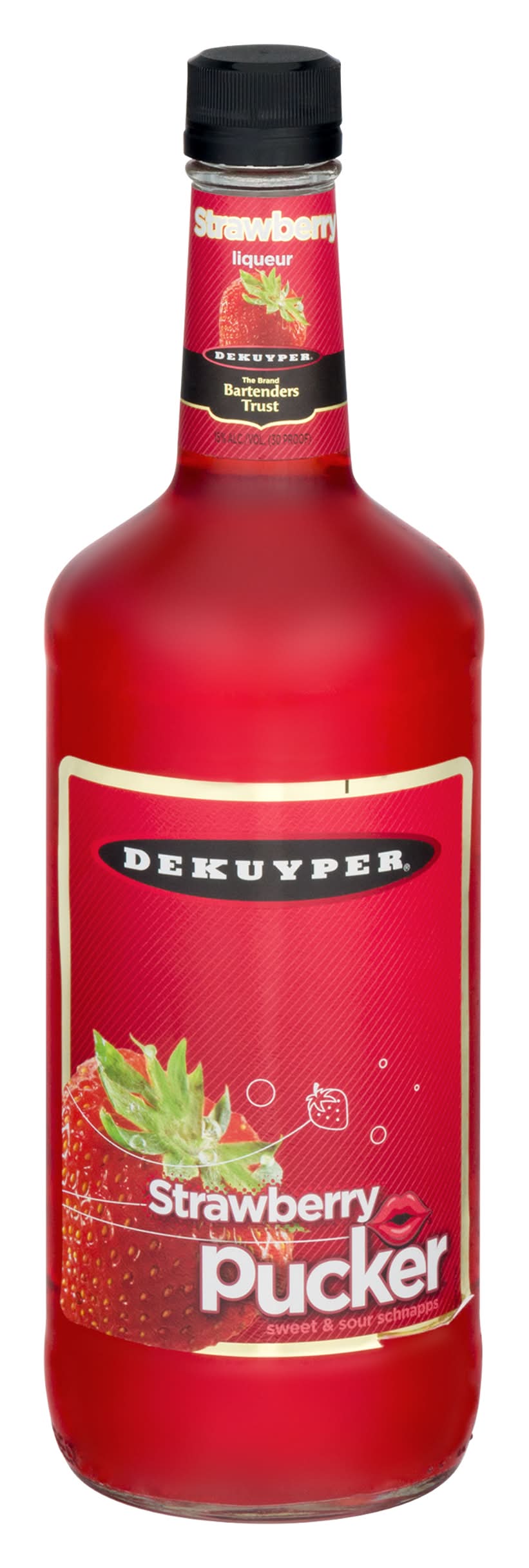 Energize your cocktails with the sweet and sour flavor of DeKuyper Pucker Strawberry Schnapps Liqueur. Blending sweet and tart strawberry flavor, this liqueur delivers a refreshing burst of flavor to your favorite cocktails. Pair it with sweet, sour or a combination of both types of ingredients to accentuate their flavor notes. With a heritage dating back more than 300 years, DeKuyper Cordials & Liqueurs continues to be on the cutting edge of the spirits industry. DeKuyper's evolution has been successful through the combination of its rich, traditional expertise and modern innovation, creating mixable and versatile cordials, liqueurs, crèmes, brandies and schnapps made from the world's finest ingredients. DeKuyper has been the brand bartenders trust to add color, flavor and fun to any cocktail. • Brand: Dekuyper • Category: Liqueur, cordials, & schnapps • Alcohol by volume: 15%