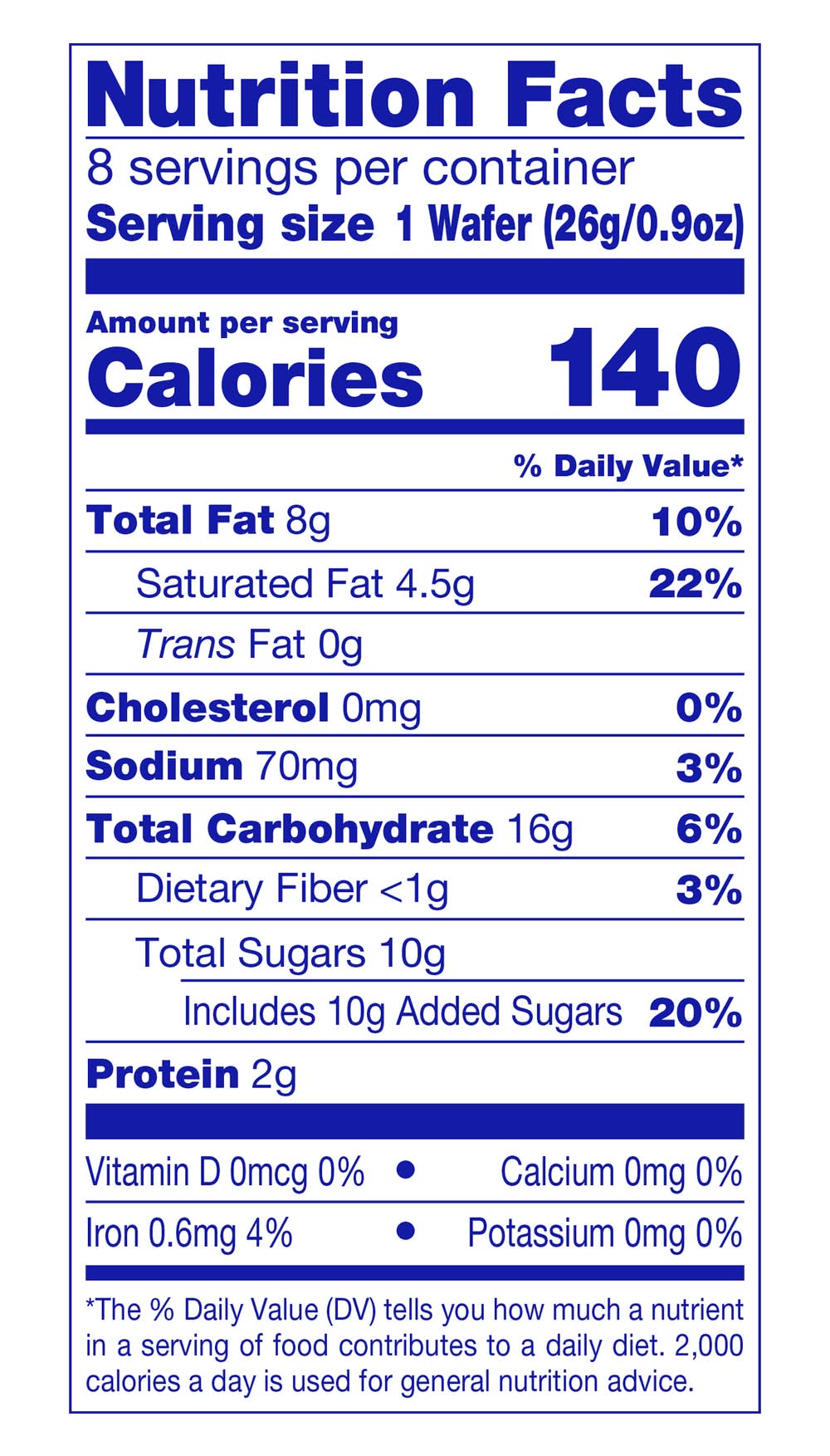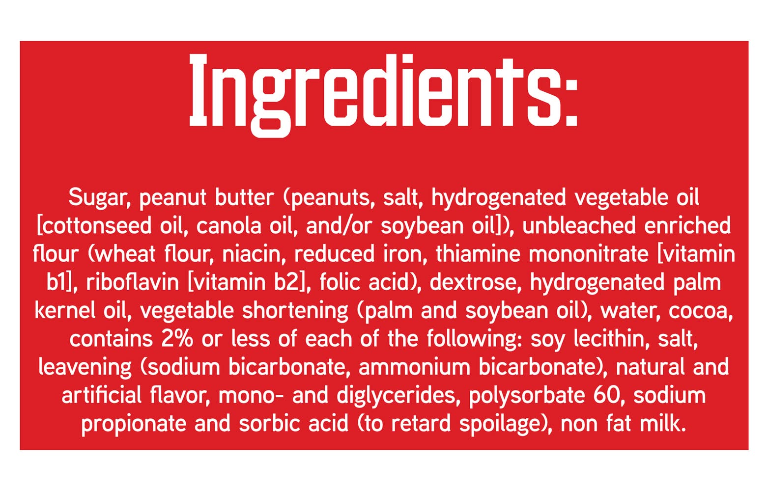 Ingredients: Sugar, Peanut Butter (Peanuts, Salt, Hydrogenated Vegetable Oil [Cottonseed Oil, Canola Oil, and/or Soybean Oil]), Unbleached Enriched Flour (Wheat Flour, Niacin, Reduced Iron, Thiamine Mononitrate [Vitamin B1], Riboflavin [Vitamin B2], Folic Acid), Dextrose, Hydrogenated Palm Kernel Oil, Vegetable Shortening (Palm and Soybean Oil), Water, Cocoa, Contains 2% or Less of Each of the Following: Soy Lecithin, Salt, Leavening (Sodium Bicarbonate, Ammonium Bicarbonate), Natural and Artificial Flavor, Mono- and Diglycerides, Polysorbate 60, Sodium Propionate and Sorbic Acid (to Retard Spoilage), Non Fat Milk Contains: Peanuts, Wheat, Soybeans, Milk, Eggs
