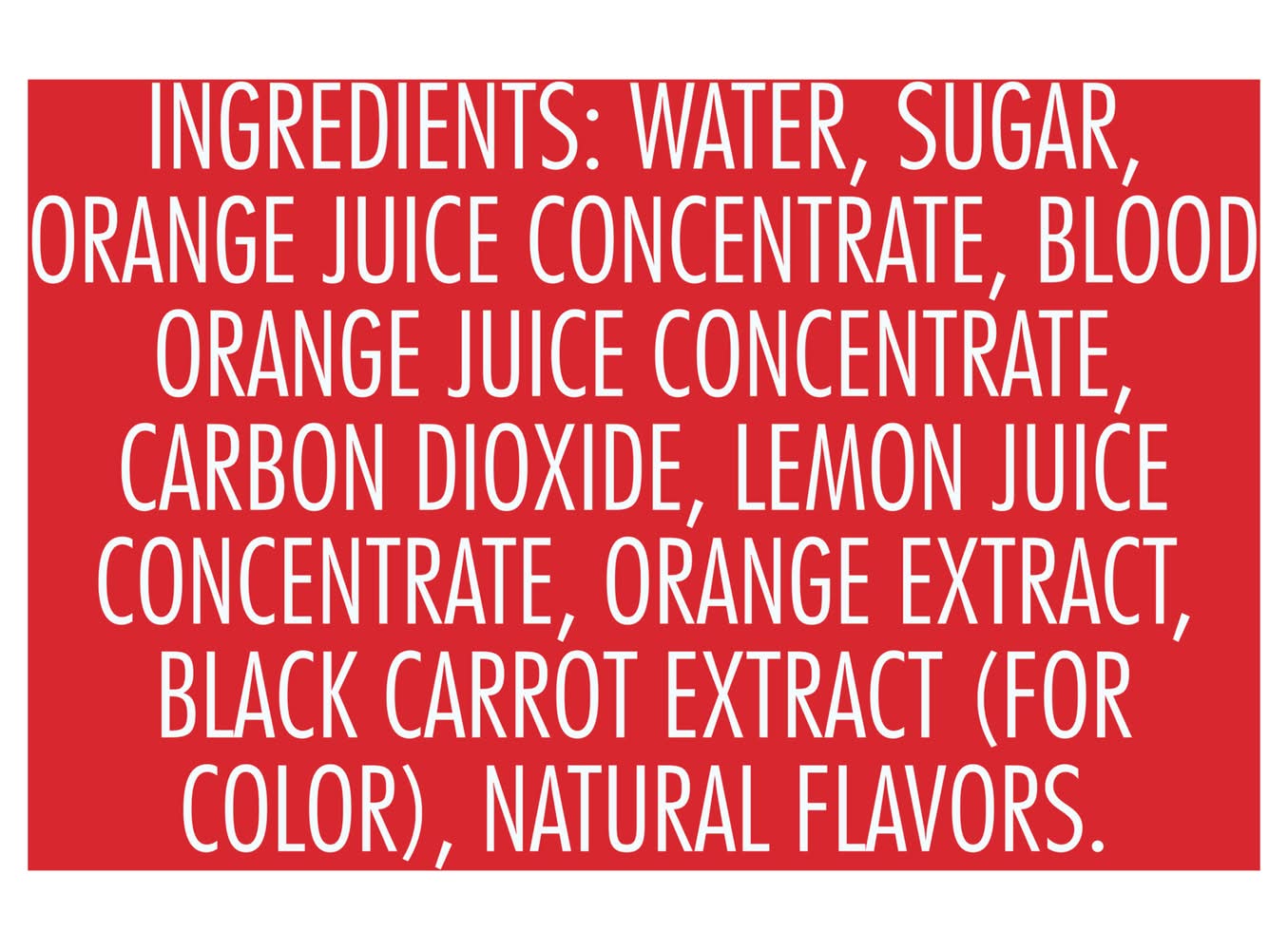 Ingredients: WATER, SUGAR, ORANGE JUICE CONCENTRATE, BLOOD ORANGE JUICE CONCENTRATE, CARBON DIOXIDE, LEMON JUICE CONCENTRATE, ORANGE EXTRACT, BLACK CARROT EXTRACT (FOR COLOR), NATURAL FLAVORS Contains: According to the FDA, the most common food allergens are milk, peanuts, eggs, fish, Crustacean shellfish, soybeans, tree nuts, wheat, and sesame. This product does not contain any of these allergens.