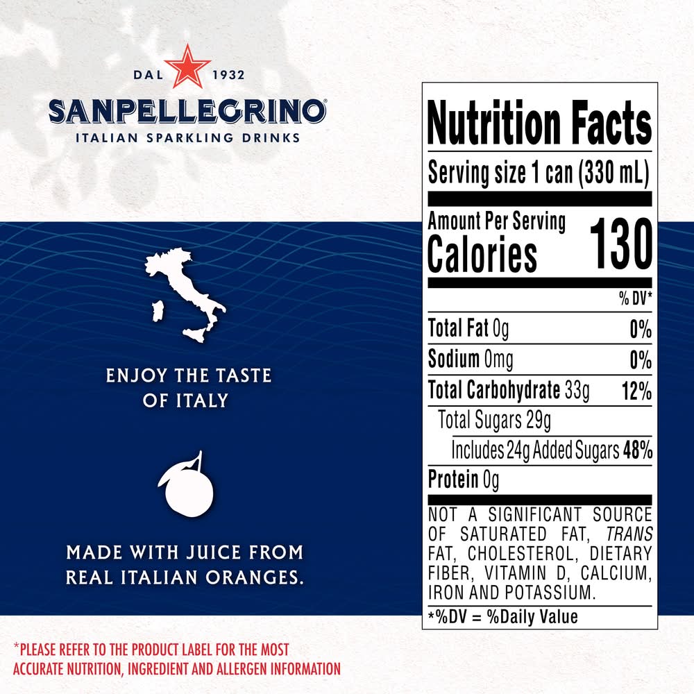 Enjoy every sparkling moment with a Sanpellegrino Aranciata Rossa Sparkling Drink. Sanpellegrino Aranciata Rossa is an orange and blood orange flavored sparkling beverage made with real orange juice and real blood orange juice (10% orange juice and 5% blood orange juice from concentrate), sugar, and other natural flavors to add a refreshing alternative to traditional seltzer water, flavored sparkling waters or carbonated soft drinks. With a delicious sweetness, this flavored sparkling beverage is made with no artificial sweeteners. Smooth on the palate, Sanpellegrino Aranciata Rossa is a delicately balanced drink with fresh and tart notes, with the perfect sweet touch to end. Enjoy Sanpellegrino Aranciata Rossa as a refreshing sparkling drink, a tasty mid-afternoon treat, or while you unwind at the end of the day. Serve this flavored sparkling beverage chilled, and garnish with a slice of orange or twig of rosemary for an expert finish. Whatever the occasion, take the time for taste with Sanpellegrino Italian sparkling drinks. Pack size: 24