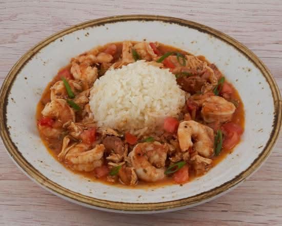 Shrimp, Chicken, Andouille Sausage, Tasso Ham, Bell Peppers, Onions, Steamed Rice, Tomatoes, Green Onions