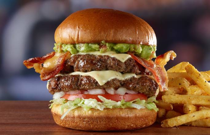 Two Bubba’s signature beef and bacon grind patties (half pound total weight) pressed and stacked. Topped with Bacon, guacamole, pepper jack cheese, lettuce, tomato and onion.