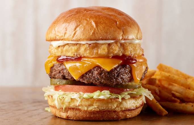 Our half pound Angus beef burger with BBQ sauce, cheddar cheese, mayo, pickles, lettuce, tomato and a hand battered onion ring.