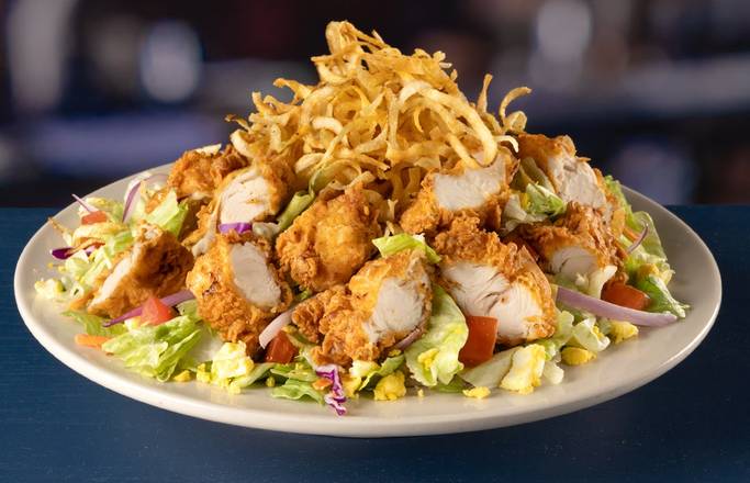 Fried chicken tenders on greens, egg, tomato, cheddar and jack cheeses, red onion and potato straws.
