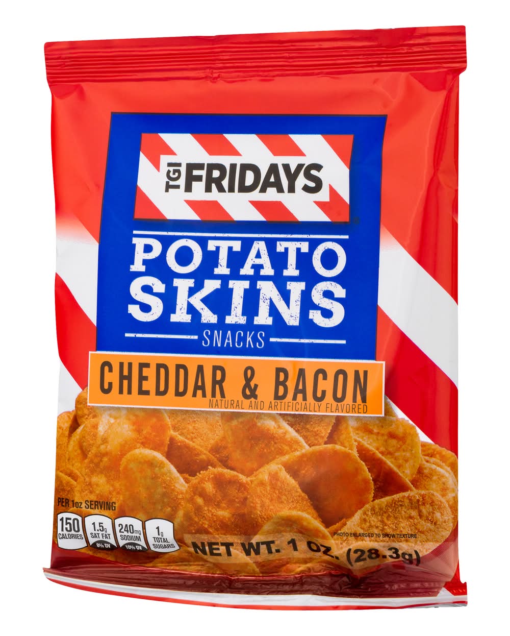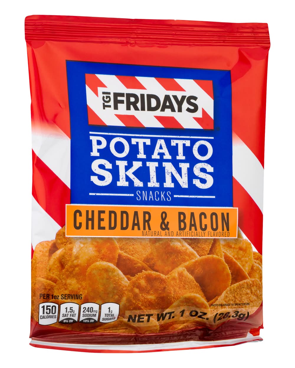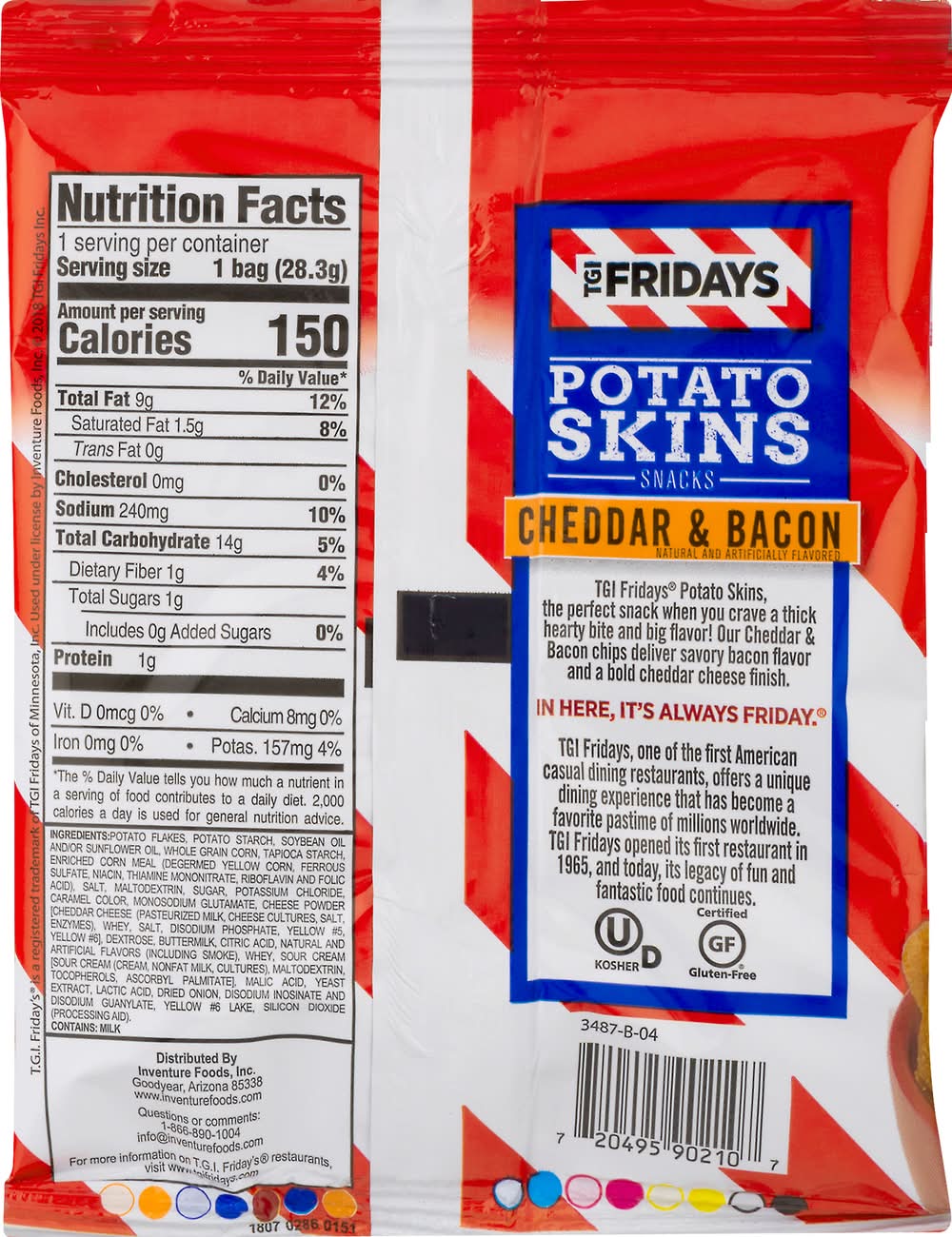 Naturally and artificially flavored. Per 1 oz Serving: 150 calories; 1.5 g sat fat (8% DV); 240 mg sodium (10% DV); 1 g total sugars. Certified Gluten-free. T.G.I Friday's potato skins, the perfect snack when you crave a thick hearty bite and big flavor! Our cheddar & bacon chips deliver savory bacon flavor and a bold cheddar cheese finish. In here, it's always Friday. TGI Fridays, one of the first American casual dining restaurants, offers a unique dining experience that has become a favorite pastime of millions worldwide. TGI Fridays opened its first restaurant in 1965, and today, its legacy of fun and fantastic food continues. www.tgifridays.com. www.inventurefoods.com. Questions or comments: 1-866-890-1004. info(at)inventurefoods.com. For more information on TGI Fridays restaurants, visit www.tgifridays.com. Number of servings: 1