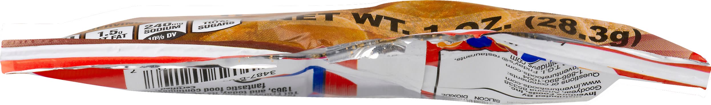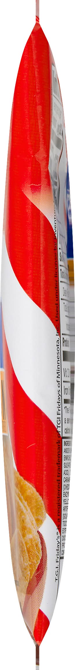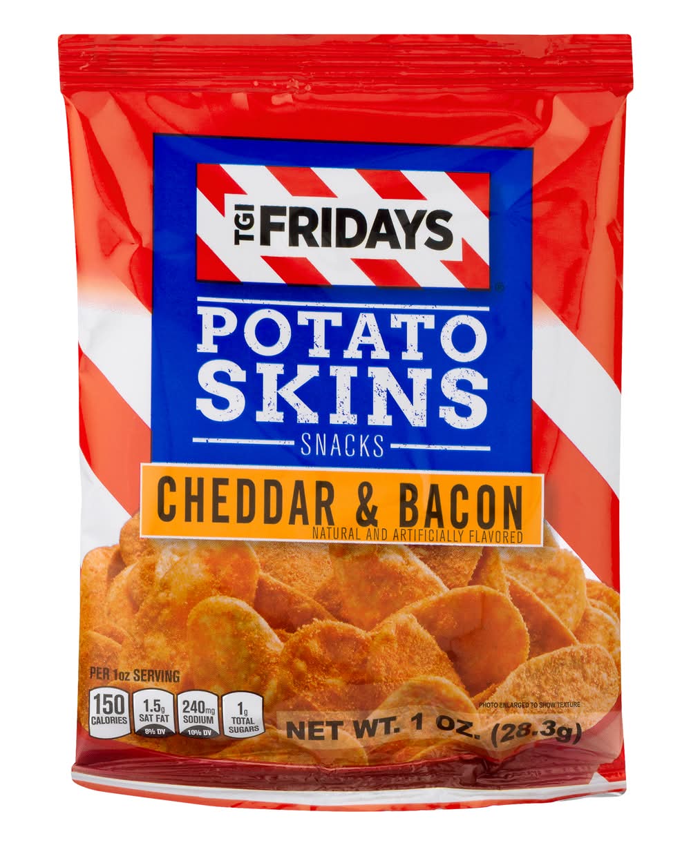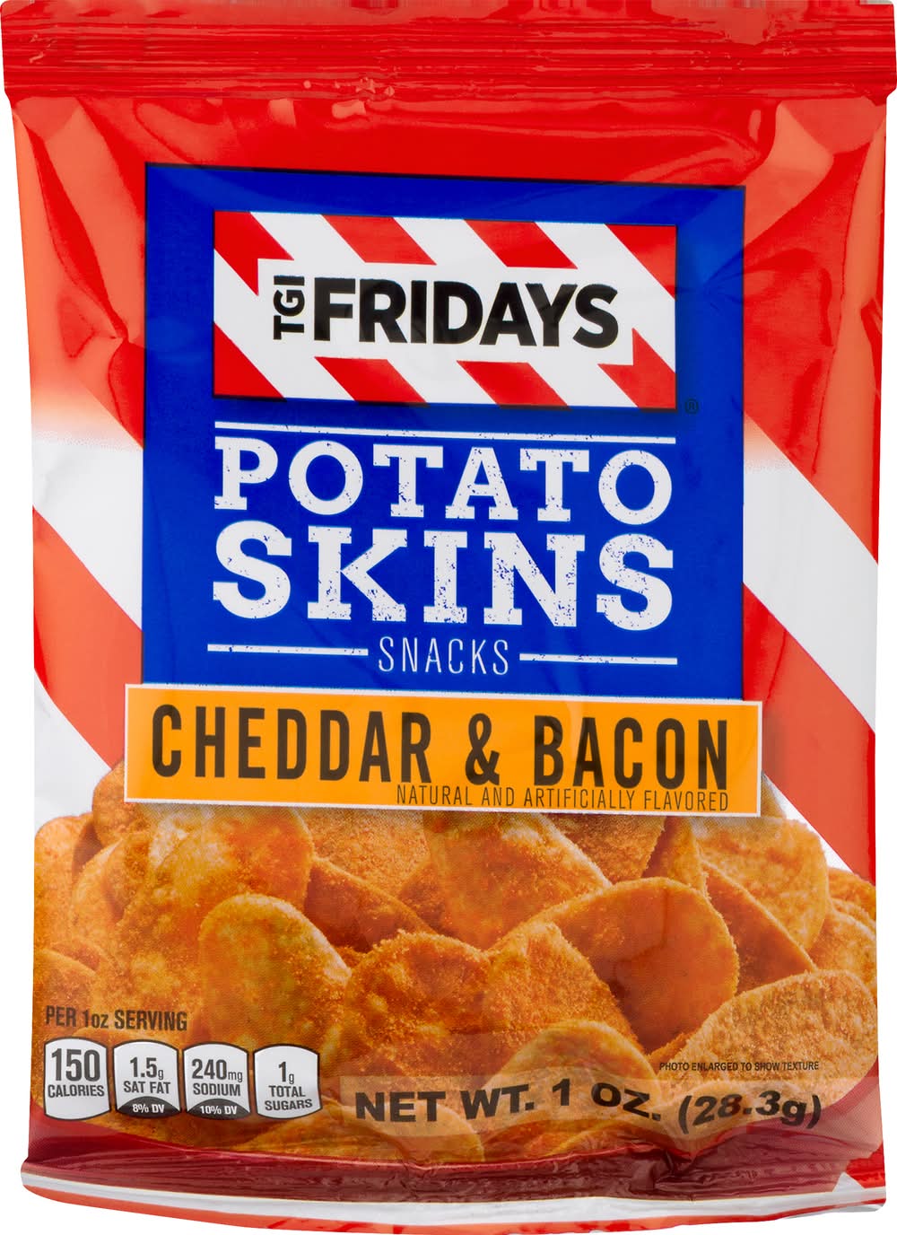 Naturally and artificially flavored. Per 1 oz Serving: 150 calories; 1.5 g sat fat (8% DV); 240 mg sodium (10% DV); 1 g total sugars. Certified Gluten-free. T.G.I Friday's potato skins, the perfect snack when you crave a thick hearty bite and big flavor! Our cheddar & bacon chips deliver savory bacon flavor and a bold cheddar cheese finish. In here, it's always Friday. TGI Fridays, one of the first American casual dining restaurants, offers a unique dining experience that has become a favorite pastime of millions worldwide. TGI Fridays opened its first restaurant in 1965, and today, its legacy of fun and fantastic food continues. www.tgifridays.com. www.inventurefoods.com. Questions or comments: 1-866-890-1004. info(at)inventurefoods.com. For more information on TGI Fridays restaurants, visit www.tgifridays.com. Number of servings: 1