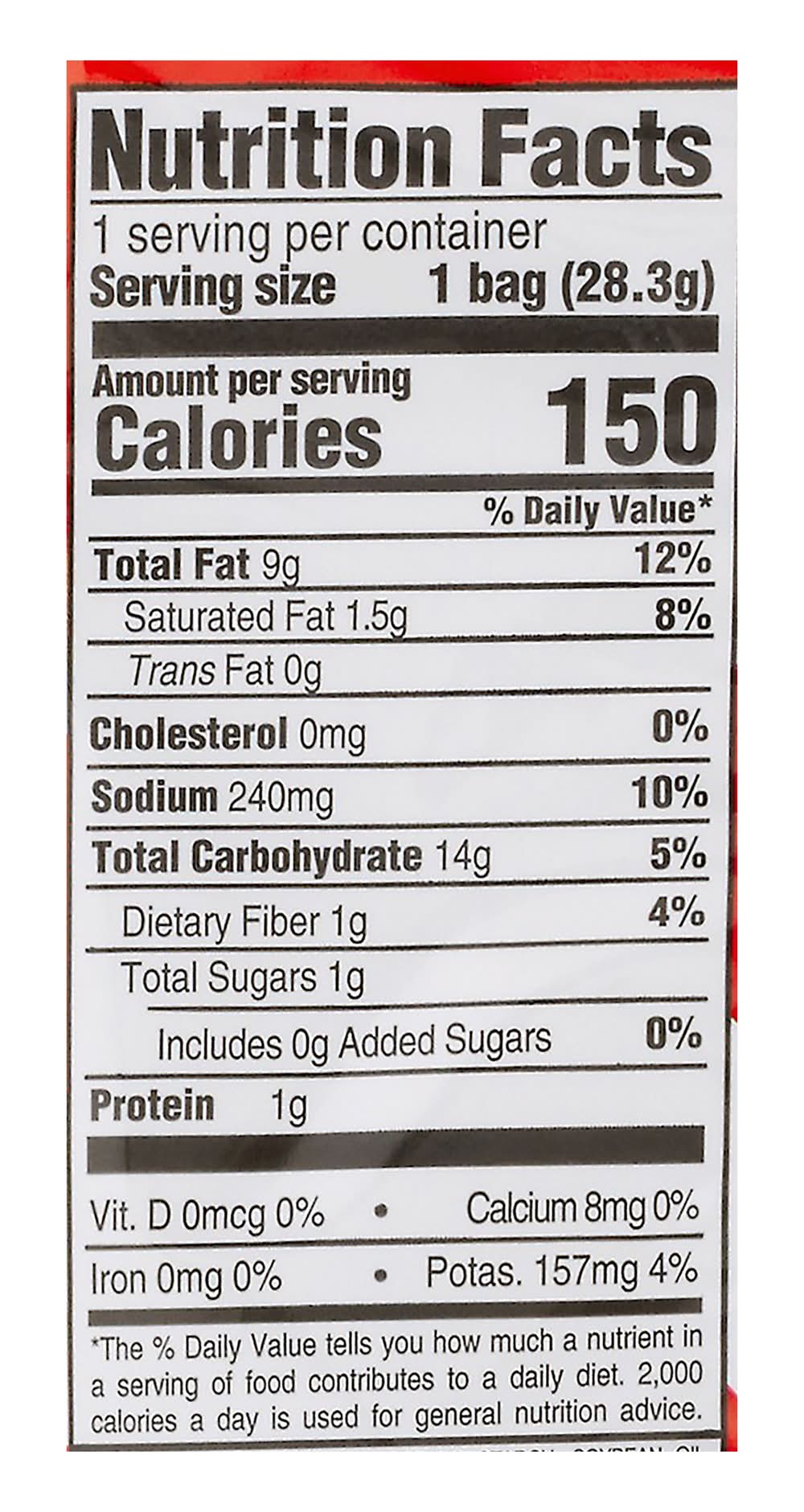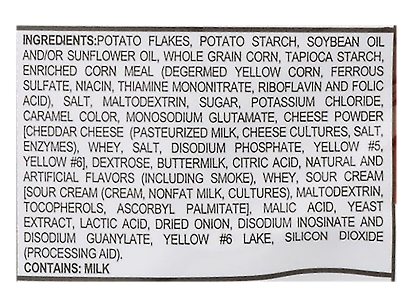 Ingredients: Potato Flakes, Potato Starch, Soybean Oil and/or Sunflower Oil, Whole Grain Corn, Tapioca Starch, Enriched Corn Meal (Degermed Yellow Corn, Ferrous Sulfate, Niacin, Thiamine Mononitrate, Riboflavin and Folic Acid), Salt, Maltodextrin, Sugar, Potassium Chloride, Caramel Color, Monosodium Glutamate, Cheese Powder (Cheddar Cheese (Pasteurized Milk, Cheese Cultures, Salt, Enzymes), Whey, Salt, Disodium Phosphate, Yellow 5, Yellow 6], Dextrose, Buttermilk, Citric Acid, Natural and Artificial Flavors (Including Smoke), Whey, Sour Cream (Sour Cream (Cream, Nonfat Milk, Cultures), Maltodextrin, Tocopherols, Ascorbyl Palmitate], Malic Acid, Yeast Extract, Lactic Acid, Dried Onion, Disodium Inosinate and Disodium Guanylate, Yellow 6 Lake, Silicon Dioxide (Processing Aid). Contains: Milk, Soybeans