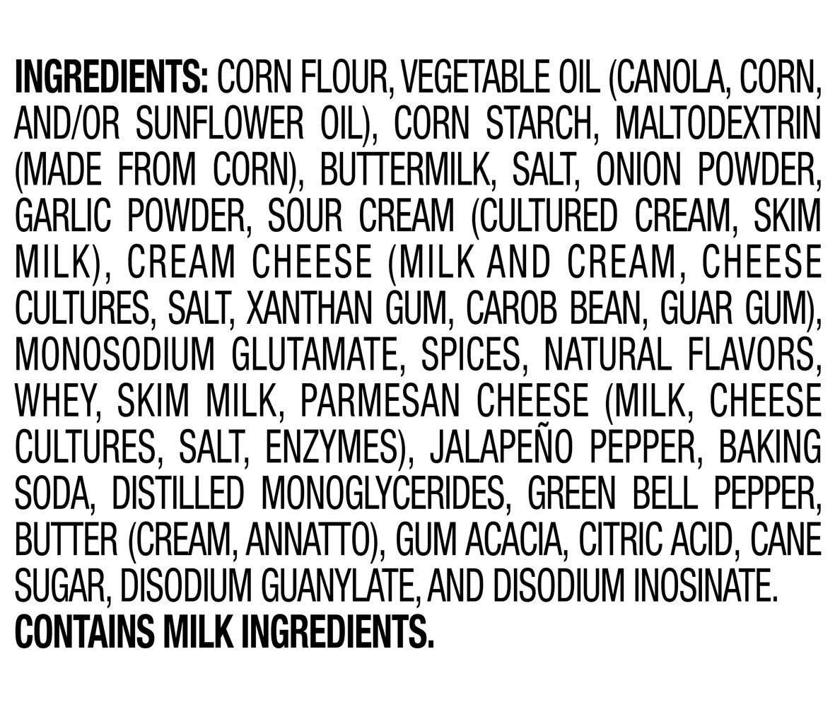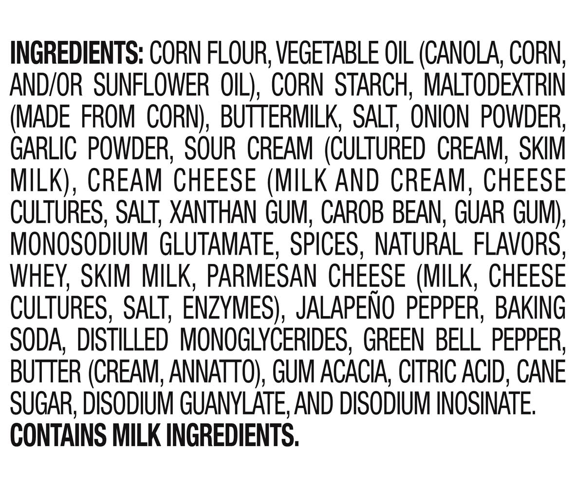 Ingredients: Corn Flour, Vegetable Oil (Canola, Corn, And/Or Sunflower), Corn Starch, Maltodextrin (Made From Corn), Buttermilk, Salt, Onion Powder, Garlic Powder, Sour Cream (Cultured Cream, Skim Milk), Cream Cheese (Milk And Cream, Cheese Cultures, Salt, Xanthan Gum, Carob Bean Gum, Guar Gum), Monosodium Glutamate, Spices, Natural Flavors, Whey, Skim Milk, Parmesan Cheese (Milk, Cheese Cultures, Salt, Enzymes), Jalapeño Pepper, Baking Soda, Distilled Monoglycerides, Green Bell Pepper, Butter (Cream, Annatto), Gum Acacia, Citric Acid, Cane Sugar, Disodium Guanylate, And Disodium Inosinate. CONTAINS MILK INGREDIENTS. Contains: CONTAINS MILK INGREDIENTS.
