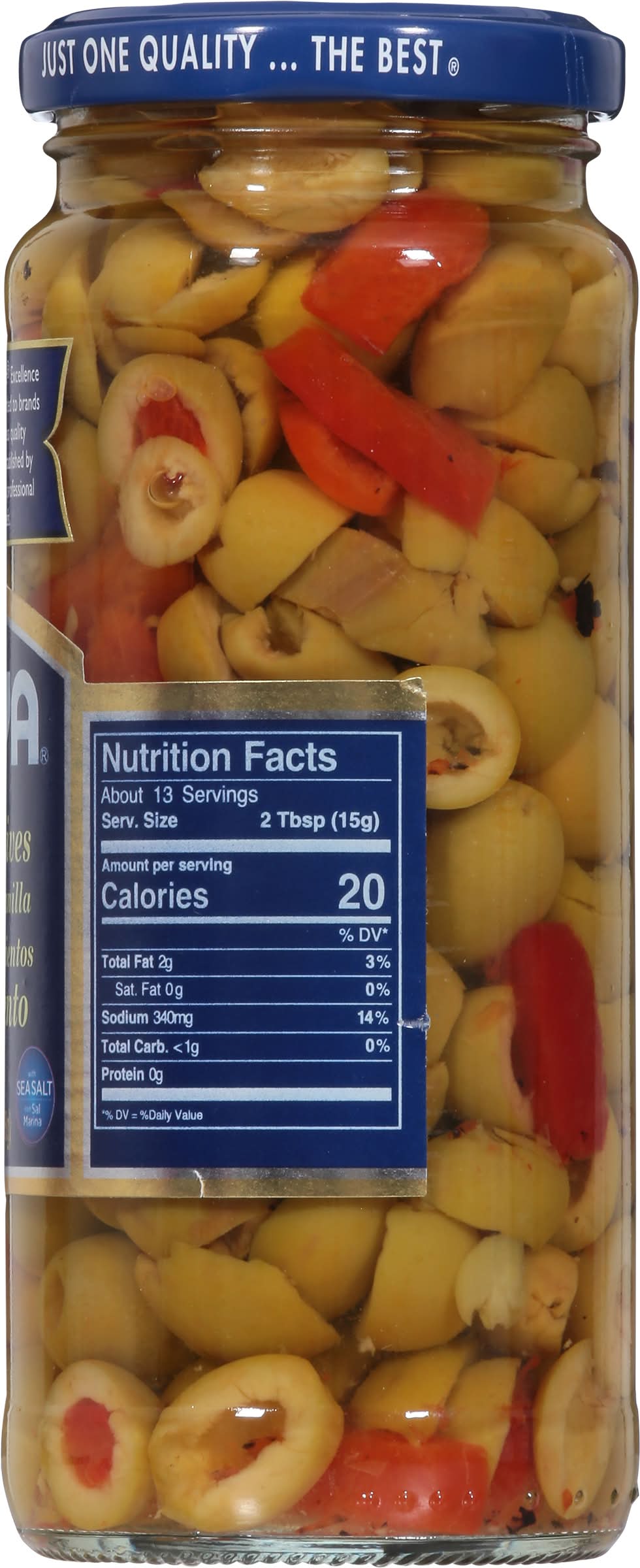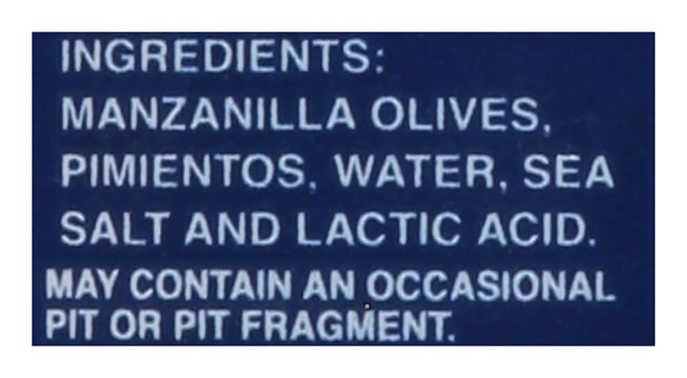 Ingredients: Manzanilla Olives, Pimientos, Water, Sea Salt and Lactic Acid