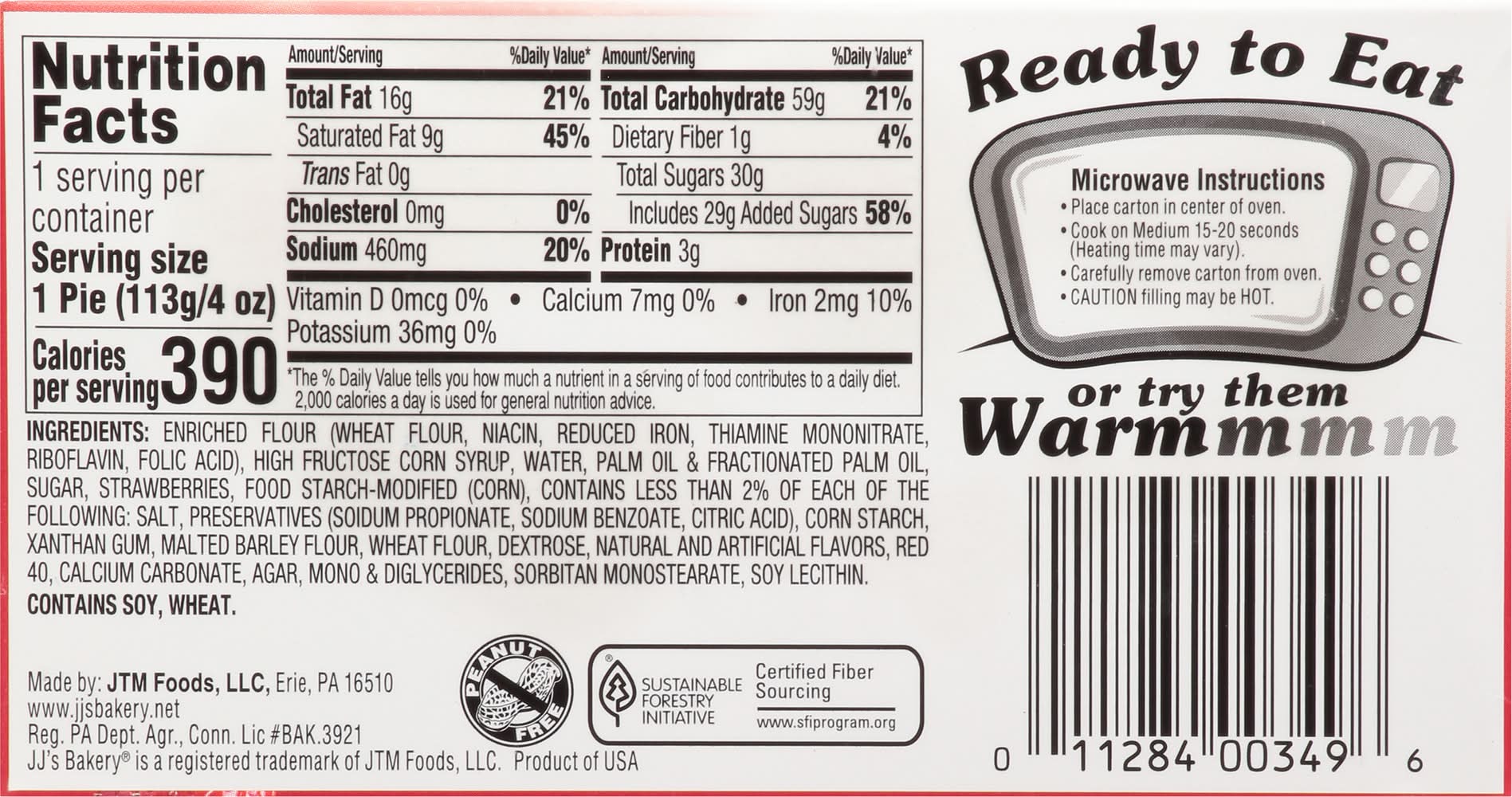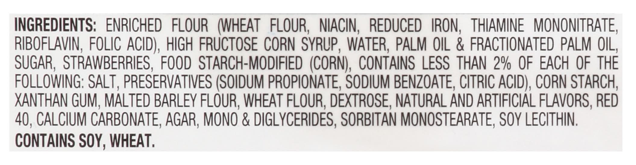 Ingredients: Enriched Flour (Wheat Flour, Niacin, Reduced Iron, Thiamine Mononitrate, Riboflavin, Folic Acid), High Fructose Corn Syrup, Water, Palm Oil & Fractionated Palm Oil, Sugar, Strawberries, Food Starch-Modified (Corn), Contains Less than 2% of Each of the Following: Salt, Preservatives (Sodium Propionate, Sodium Benzoate, Citric Acid), Corn Starch, Xanthan Gum, Malted Barley Flour, Wheat Flour, Dextrose, Natural and Artificial Flavors, Red 40, Calcium Carbonate, Agar, Mono & Diglycerides, Sorbitan Monostearate, Soy Lecithin Contains: Wheat, Soybeans