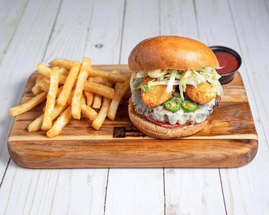 8 oz. Angus chuck patty served on a butter-grilled brioche bun, chipotle, lettuce, tomato, fried jalapeno poppers, and pepper jack cheese. Served with fries.