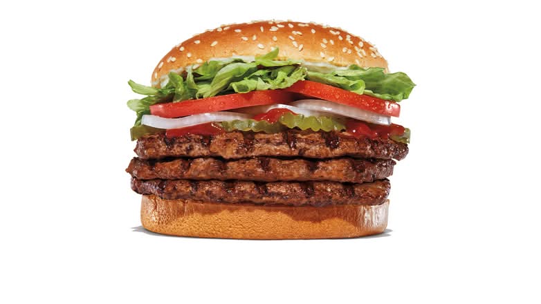 Three ¼ lb* flame-grilled beef patties with juicy tomatoes, crisp lettuce, creamy mayonnaise, ketchup, crunchy pickles, and sliced white onions on a toasted sesame seed bun.