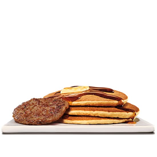 Three fluffy pancakes drizzled in syrup with a side of sizzling sausage.