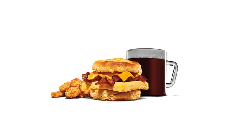 Crispy bacon, fluffy eggs, and melted American cheese on a warm buttermilk biscuit. Served with Hash Browns and your choice of Drink.