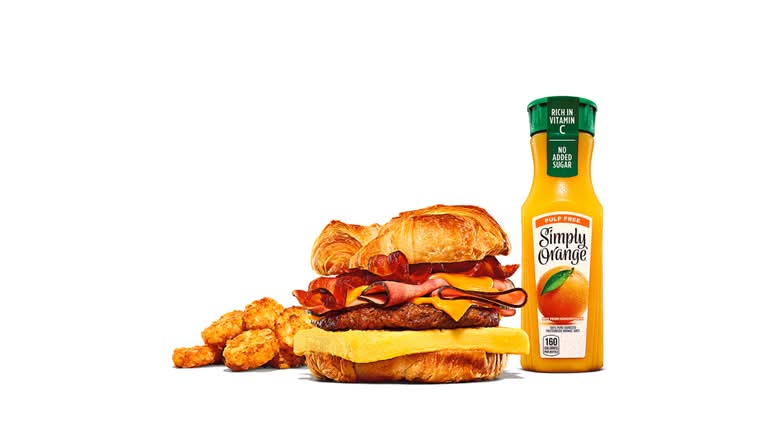 Black Forest ham, sizzling sausage, crispy bacon, fluffy eggs, and melted American cheese on a toasted croissant. Served with Hash Browns, and your choice of Drink.
