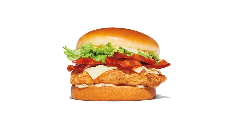 Crispy white meat breast fillet topped with savory sauce, creamy swiss cheese, crispy bacon, lettuce and juicy tomatoes on a toasted potato bun.